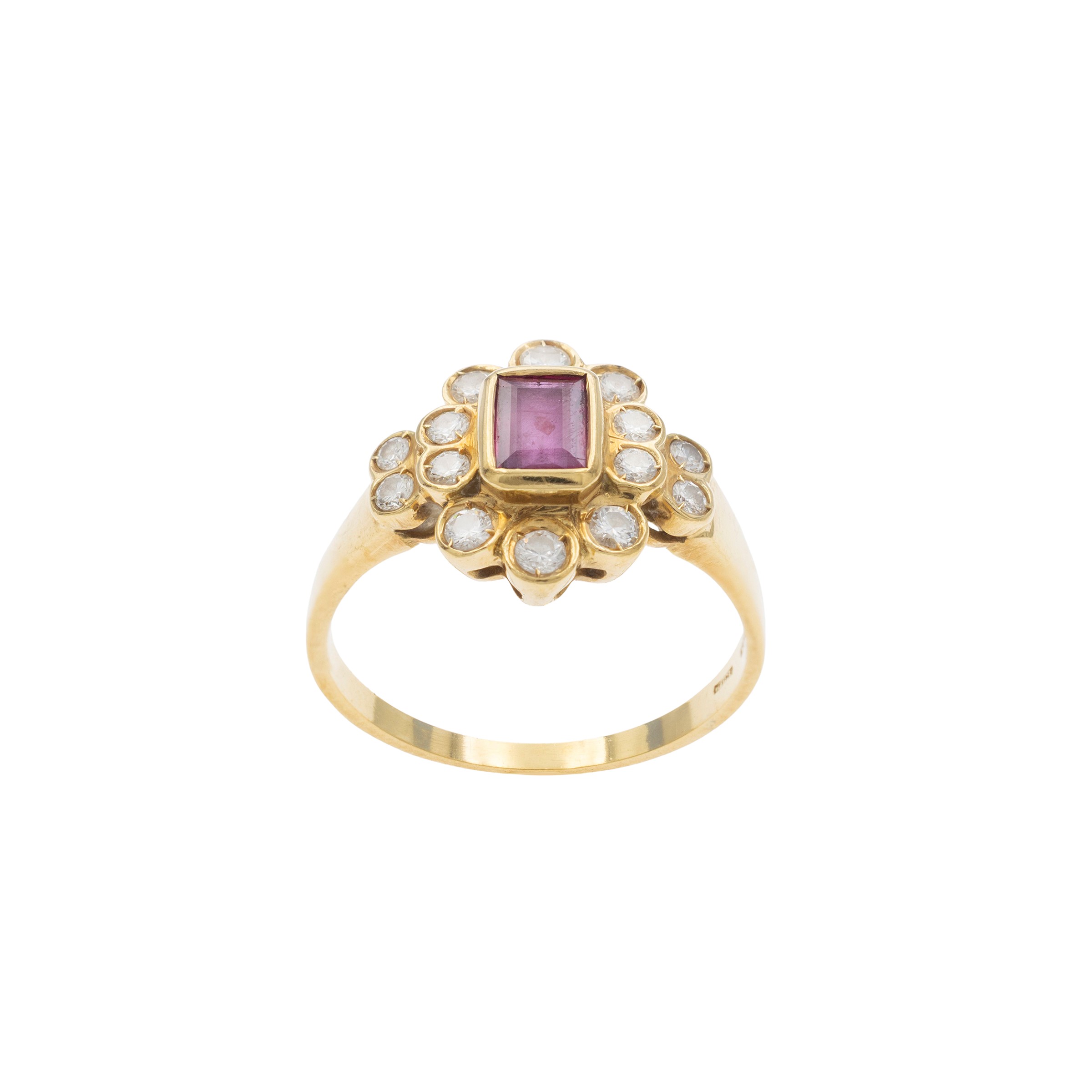 peso 5 gr.rubino taglio ottagonale a gradini ct 0,80 circa, diamanti taglio brillante ct 0,70 circa, misura 20,5