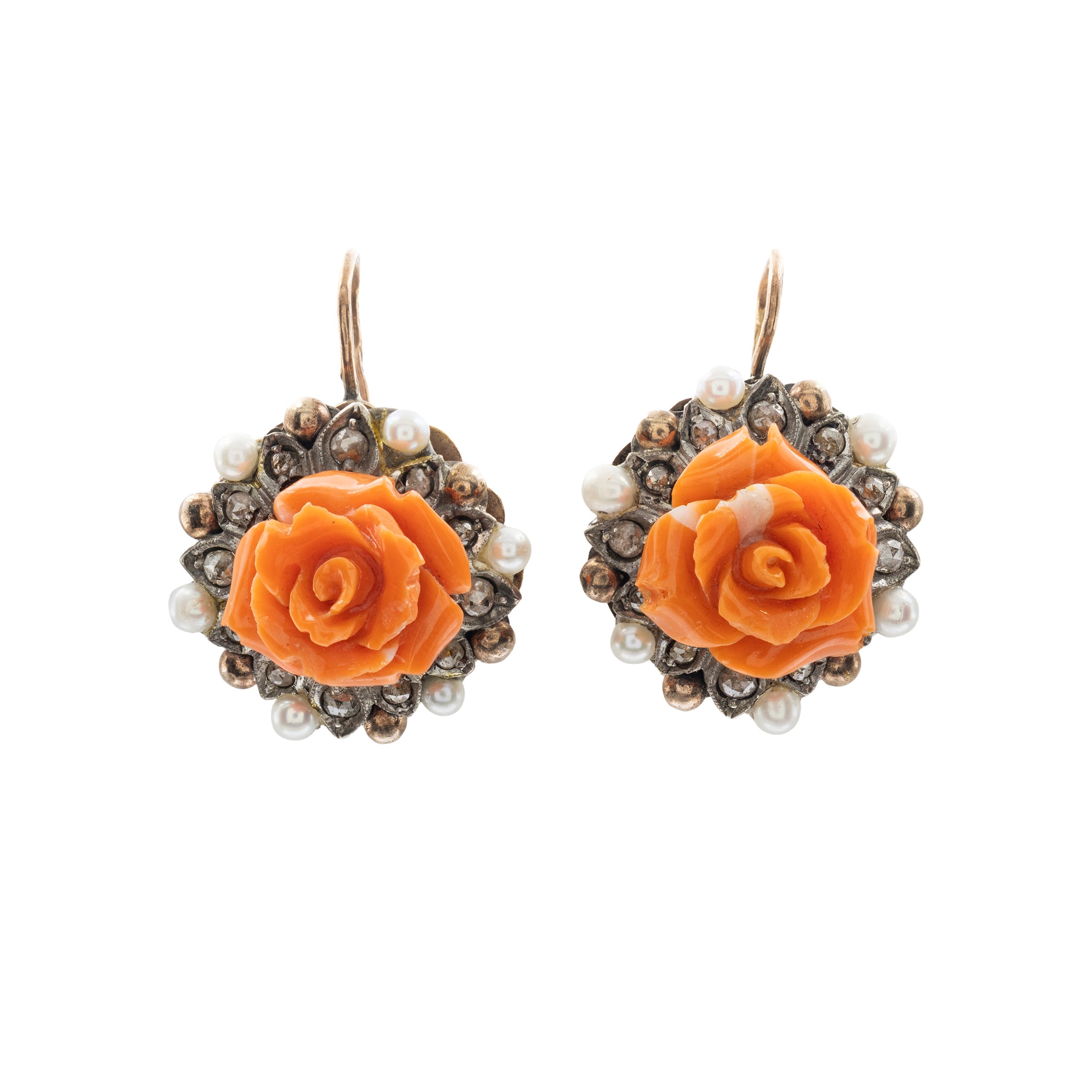 peso 19 gr.rose di corallo, rose di diamante e perline, diametro 2,3 cm. - lunghezza 3,2 cm.