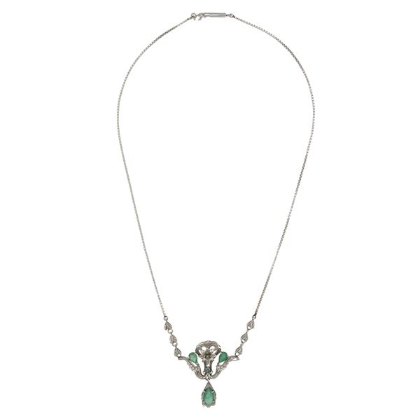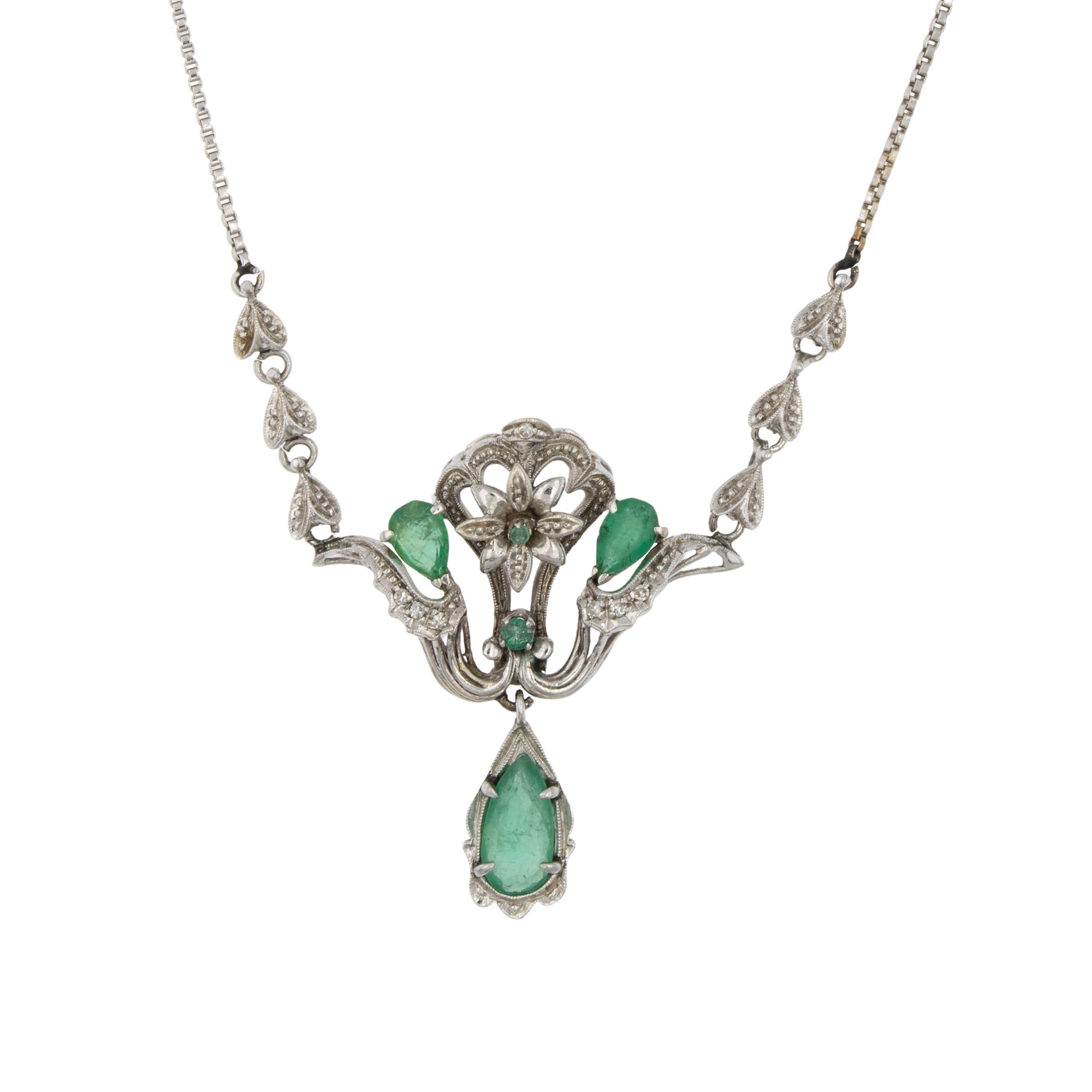 smeraldi taglio a goccia e tondi ct 1,80 circa e diamanti taglio huit-huit, lunghezza 44 cm.