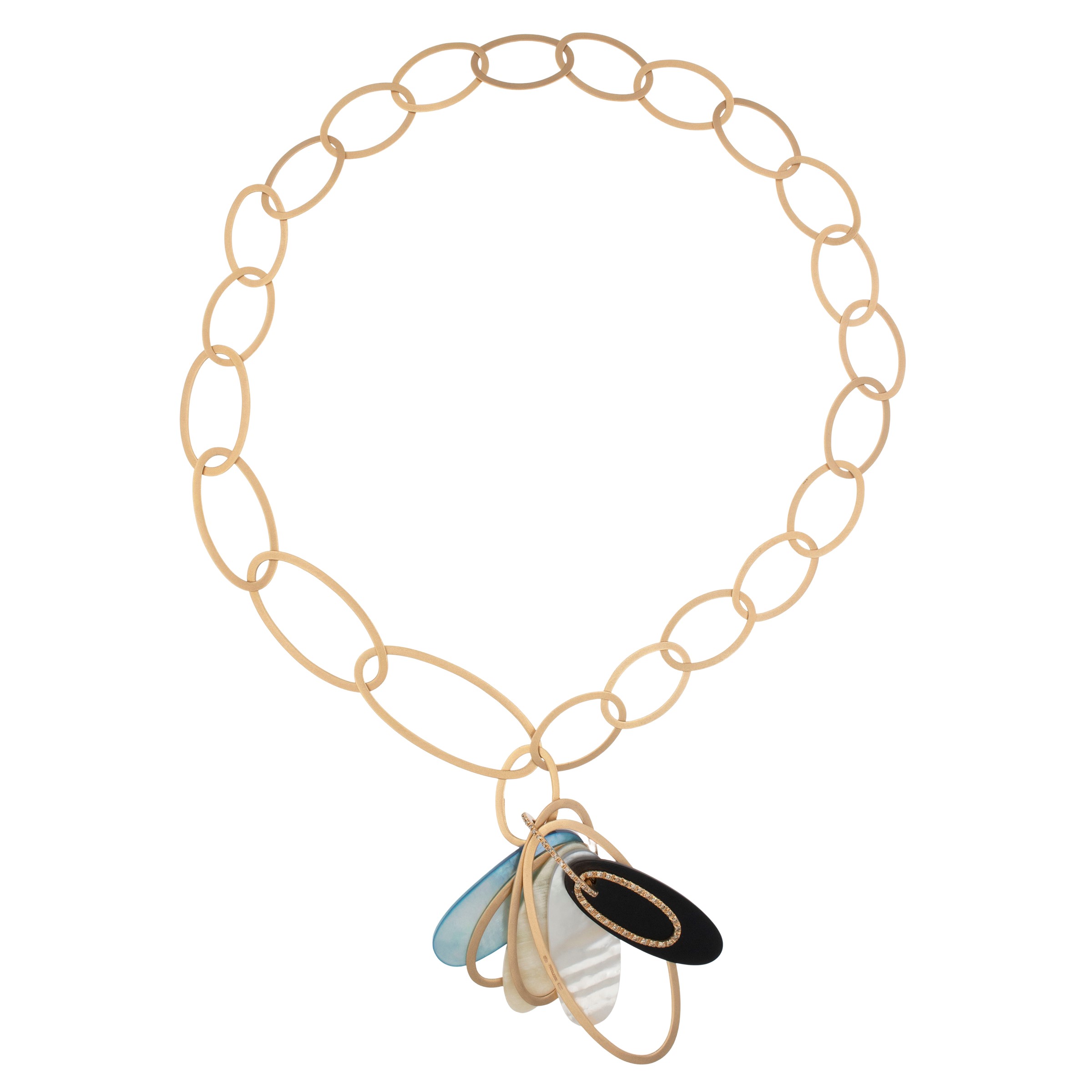 pendente removibile e componibile composto da maglie in oro e diamanti brown ed elementi in madreperla e pietre dure, completa di scatola