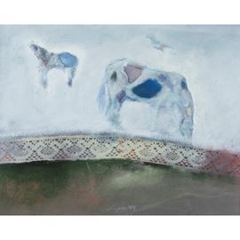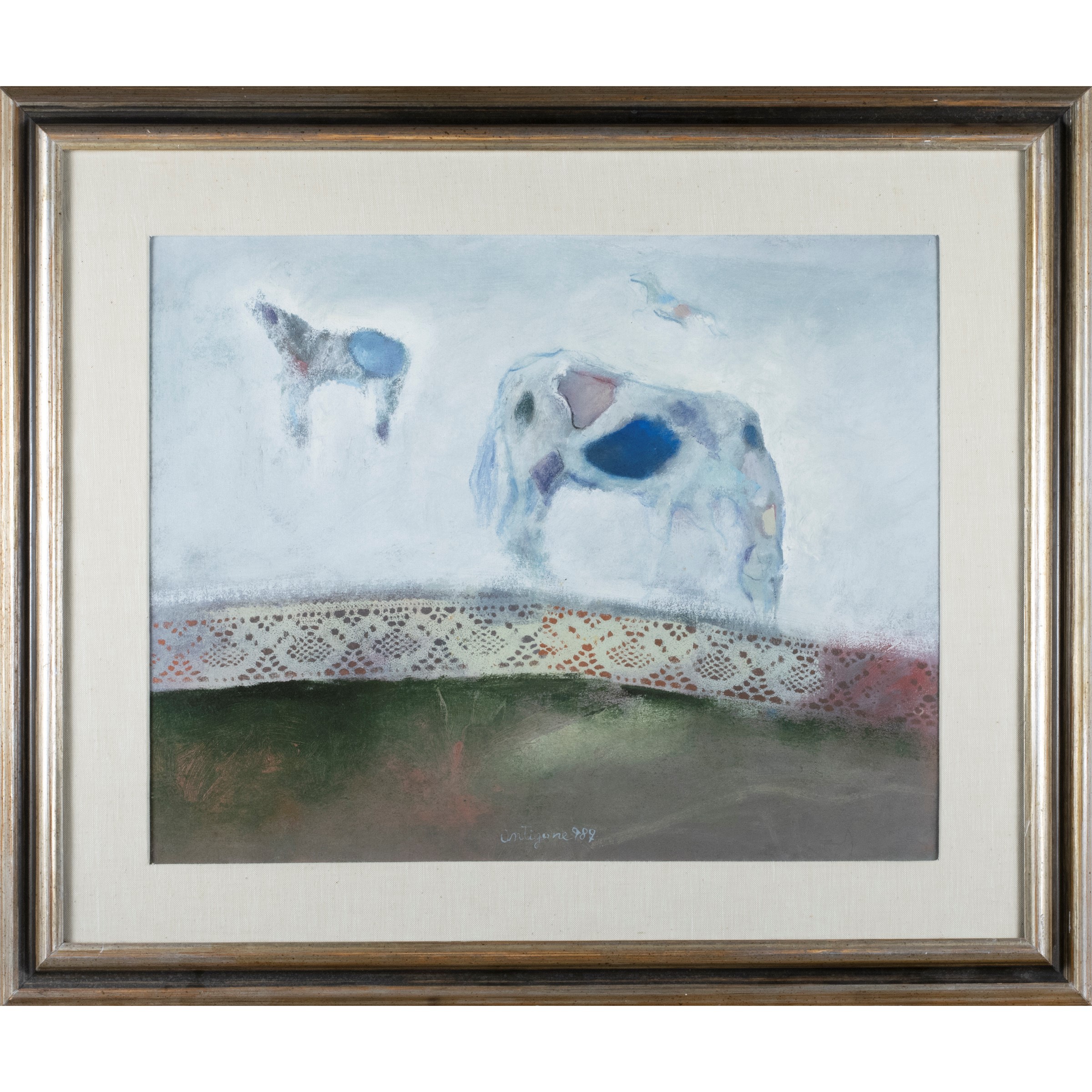 42x53 cm."Antigone", 1989, tecnica mista su cartone telato, titolato e datato in basso al centro, entro cornice
