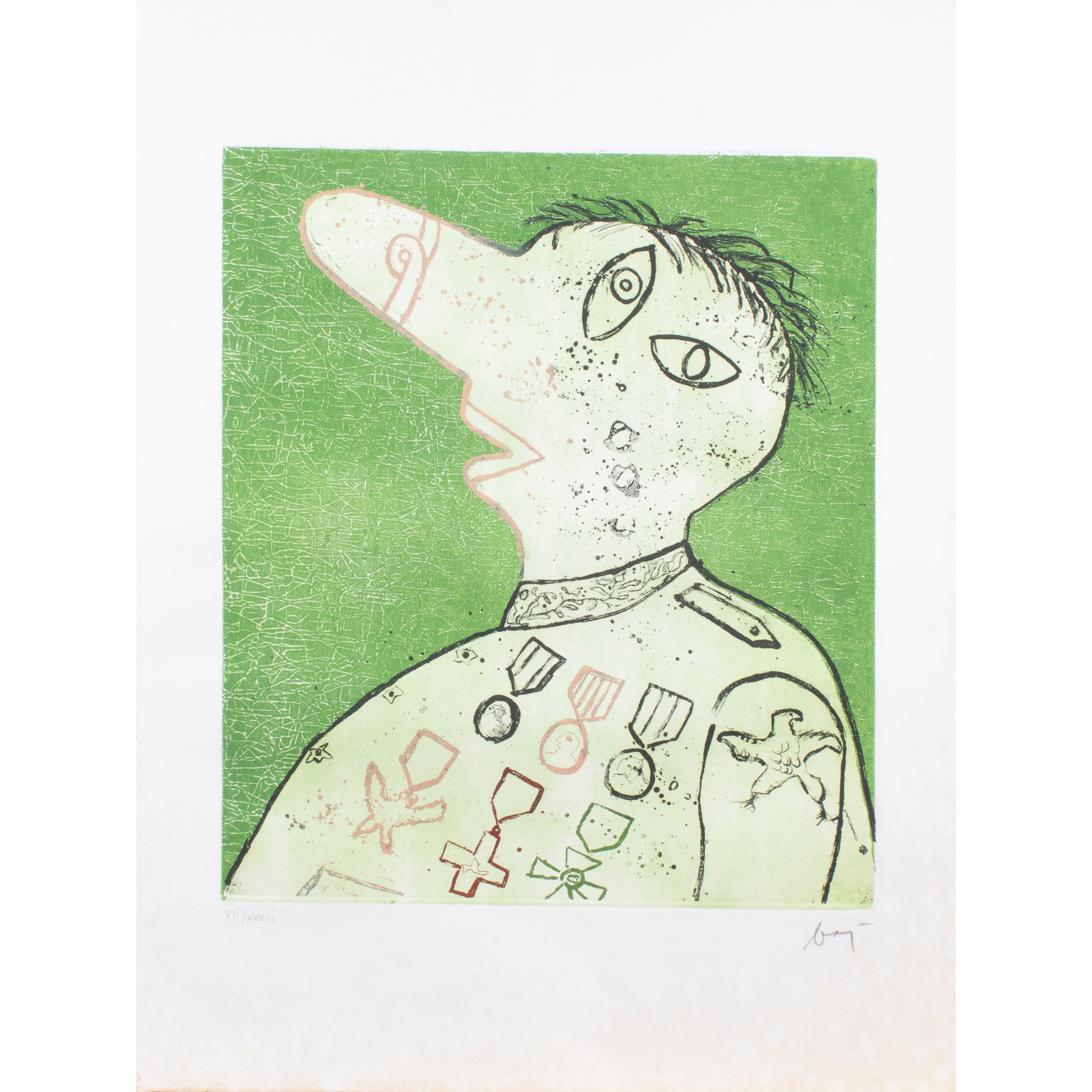 60x45 cm."Suwarov Rymnisky durante la Campagna di Russia", 1969, acquaforte e acquatinta a colori, es. VII/XXXIII, firmato in basso a destra, timbro a secco "Il torcoliere" in basso a destra, foglio libero