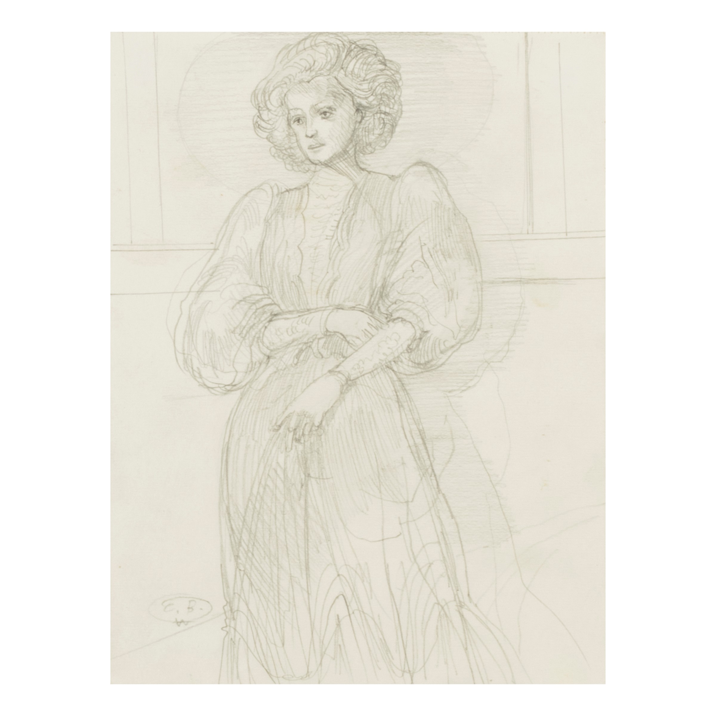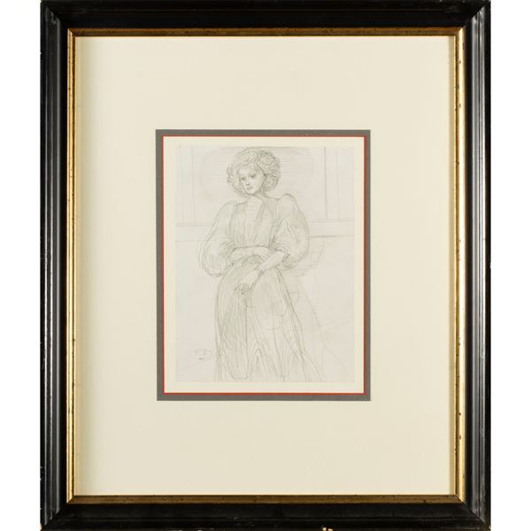 22x17 cm."Figura femminile", matita su carta, siglato in basso a sinistra, entro cornice