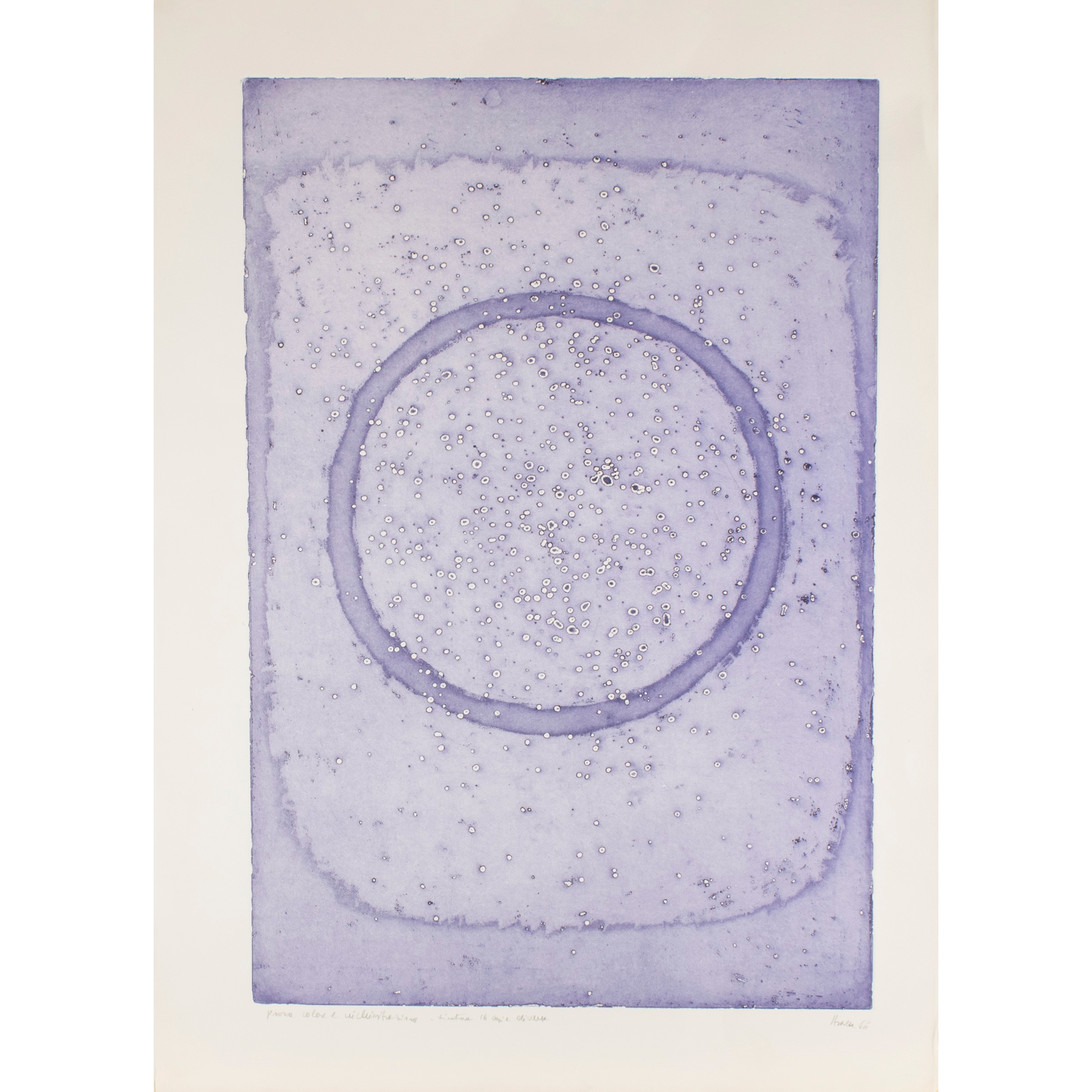 70,5x51 cm."Senza titolo", 1966, acquatinta a colori, es. p.a. prova colore e inchiostrazione, firmata e datata in basso a destra, foglio libero.