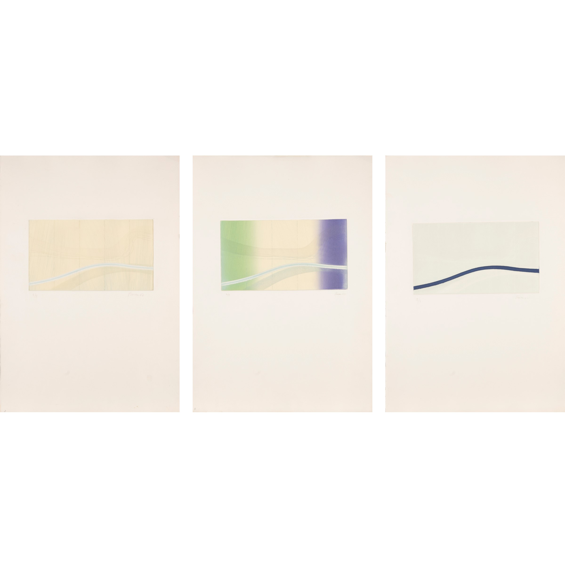 50x35 cm."Senza titolo", 1967, tre acqueforti a colori, es. 2/9, firmate e datate in basso a destra, fogli liberi