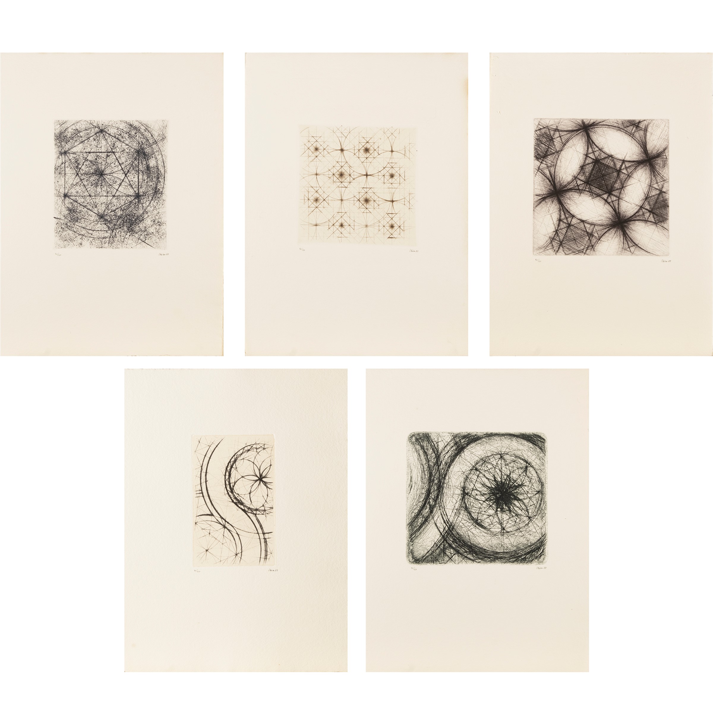 31x23,5 cm."Giardino d'Euclide", 1988, cartella contenente cinque incisioni su carta a tino Richard De Bas, es. 21/40, firmate e datate in basso a destra.
