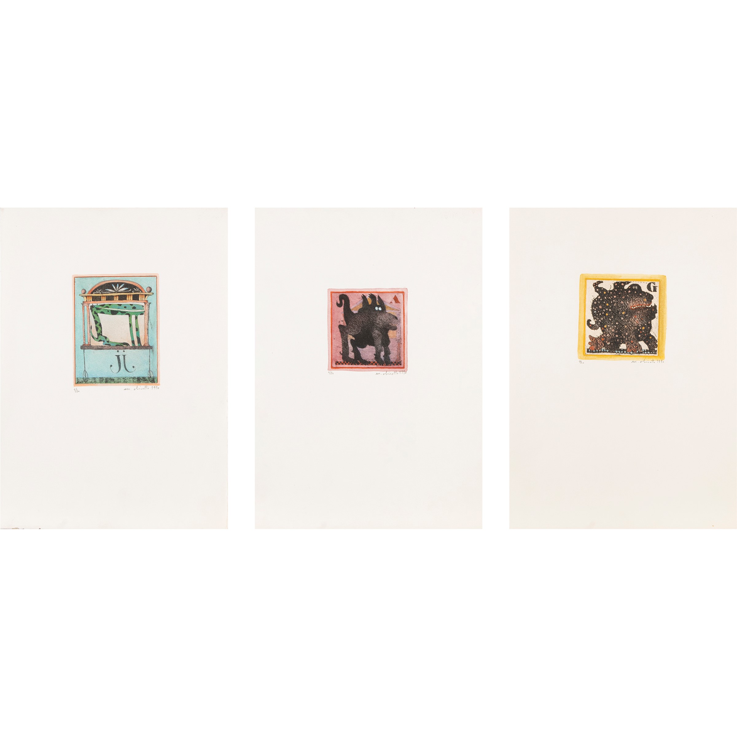 "Senza titolo", 1990, tre acqueforti ritoccate a mano, es. 1/30, firmate e datate in basso a destra, fogli liberi