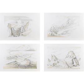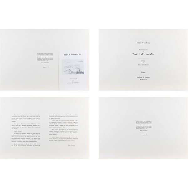 35x50 cm."Teatri d'Anatolia", 1963, cartella contenente quattro litografie a colori, es. 94/99, firmate e datate in basso a destra, testo di Enzo Siciliano, stampate da Bulla & Figli, Roma, edita da Galleria Il Disegno, Roma