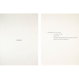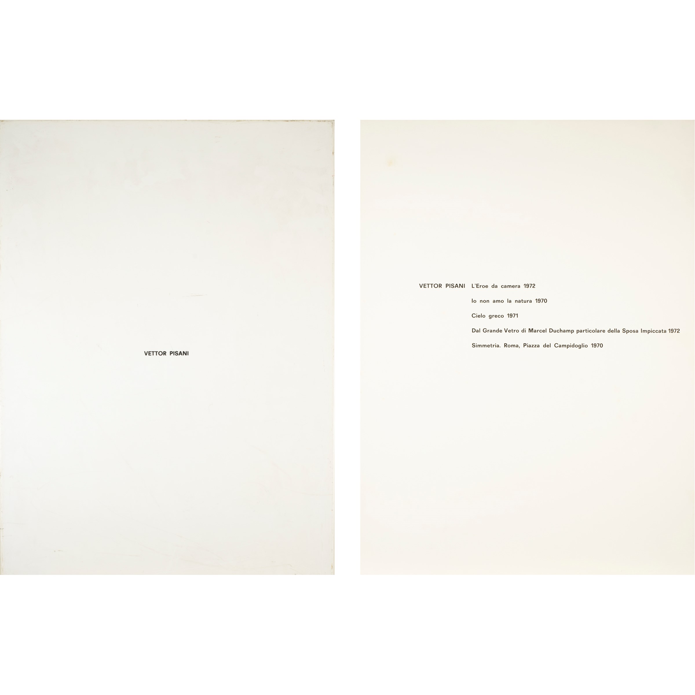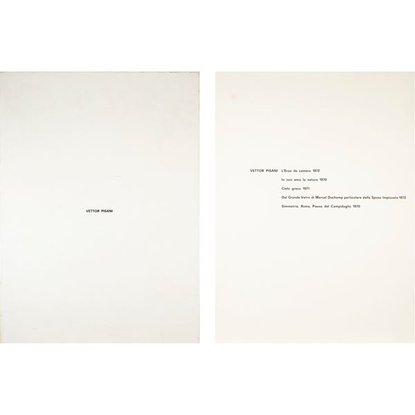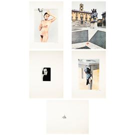 "L'Eroe da camera", 1972, "Io non amo la natura" 1970, "Cielo greco" 1971, "Dal Grande Vetro di Marcel Duchamp particolare delle Sposa Impiccata" 1972, "Simmetria. Roma, Piazza del Campidoglio", 1970, cartella contenente cinque opere grafiche, es. nd. firmate in basso a destra, due datate 1972, Edizioni Box 18, Macerata, entro custodia in plastica bianca.