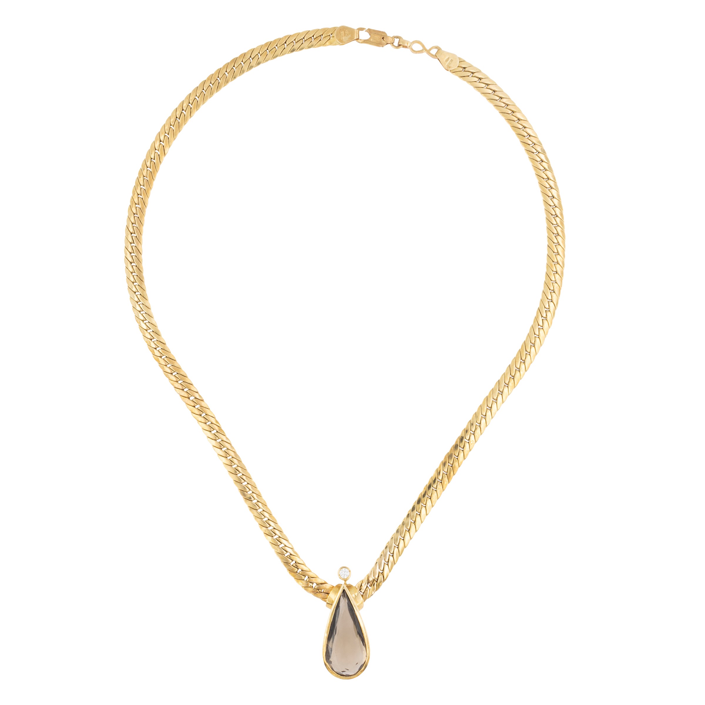 peso 26 gr.centrata da un quarzo citrino fumé taglio a pera sfaccettato e un diamante taglio brillante ct 0,08 circa, lunghezza 47 cm.