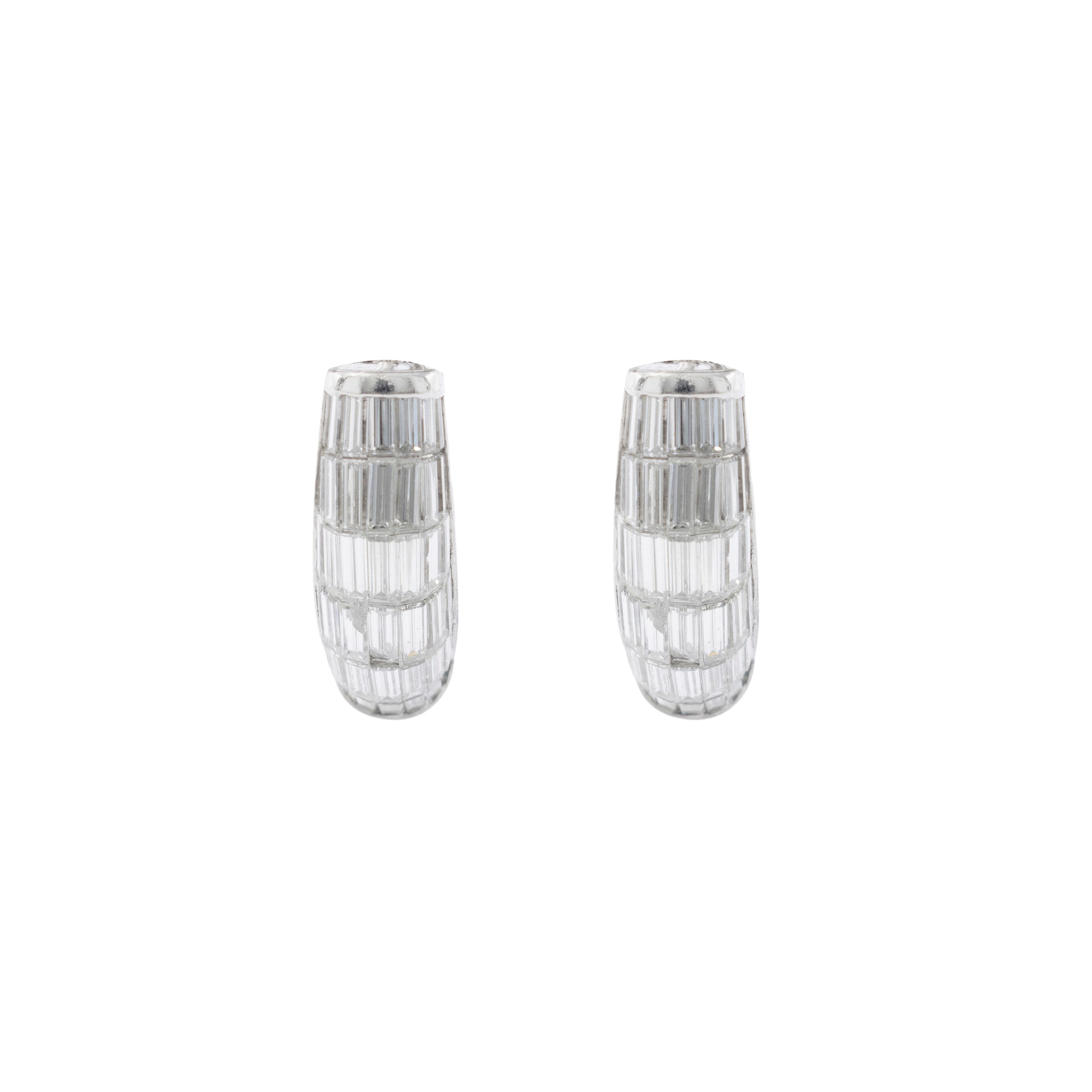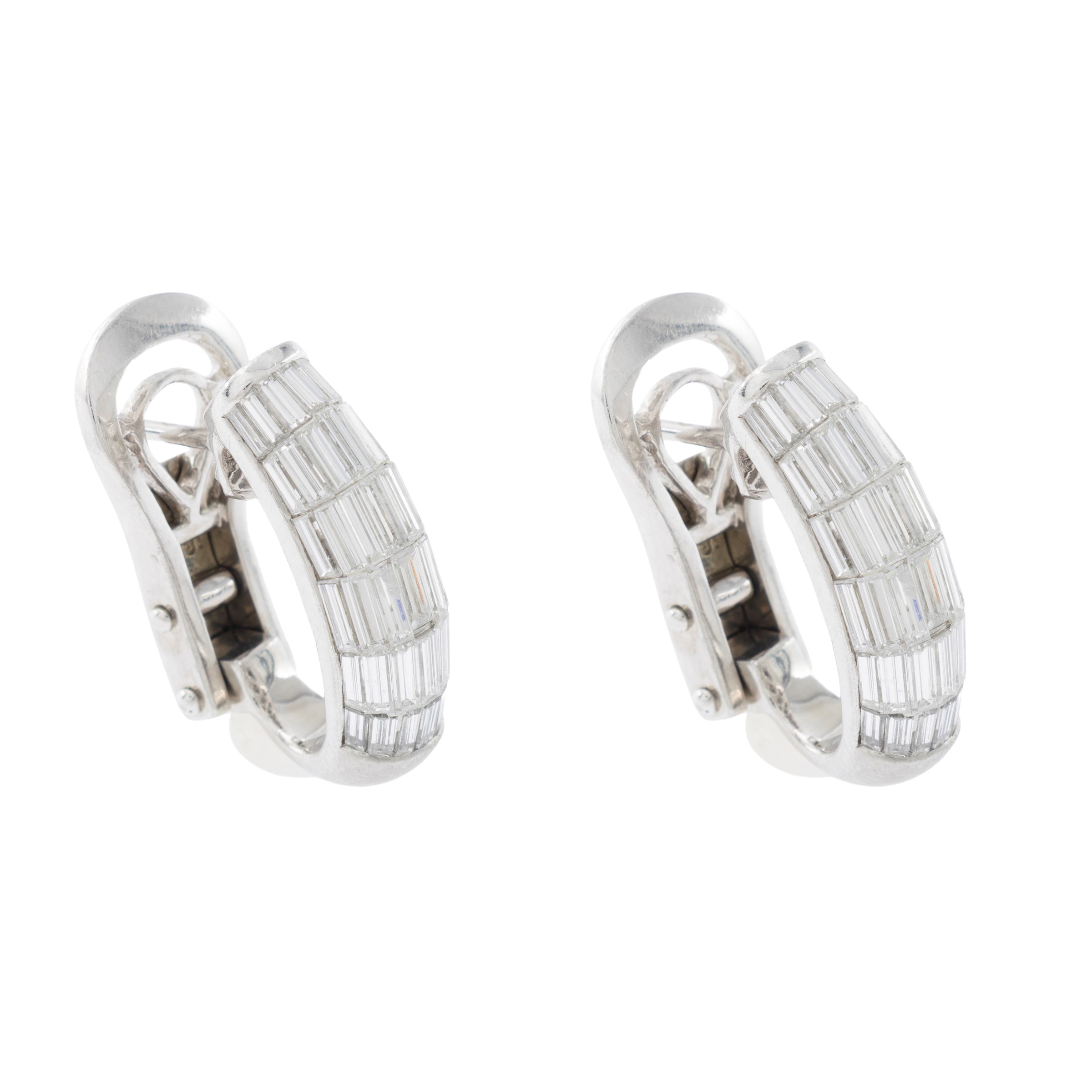 peso 12 gr.taglio baguettes ct 1,80 circa, due diamanti difetti, clips in oro bianco 18kt, dimensioni 1,8x0,5 cm.