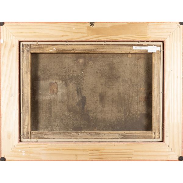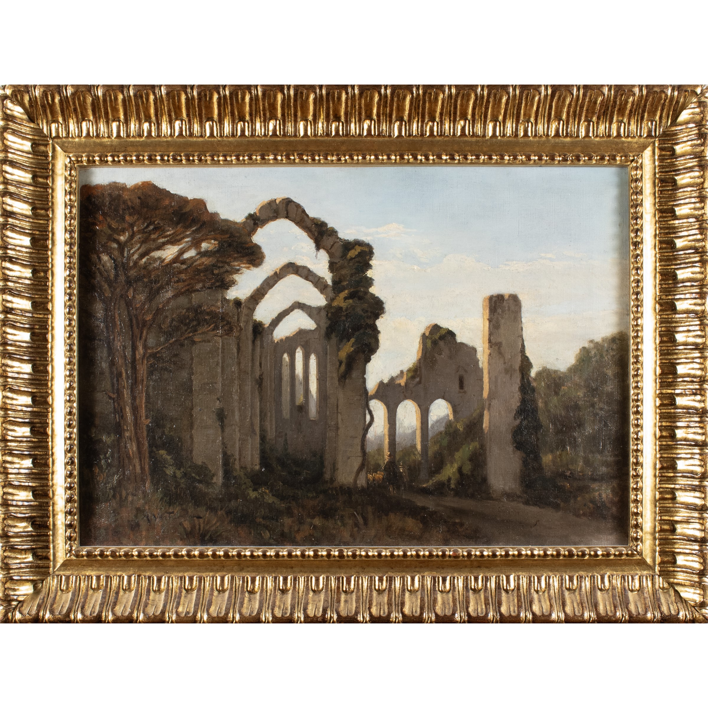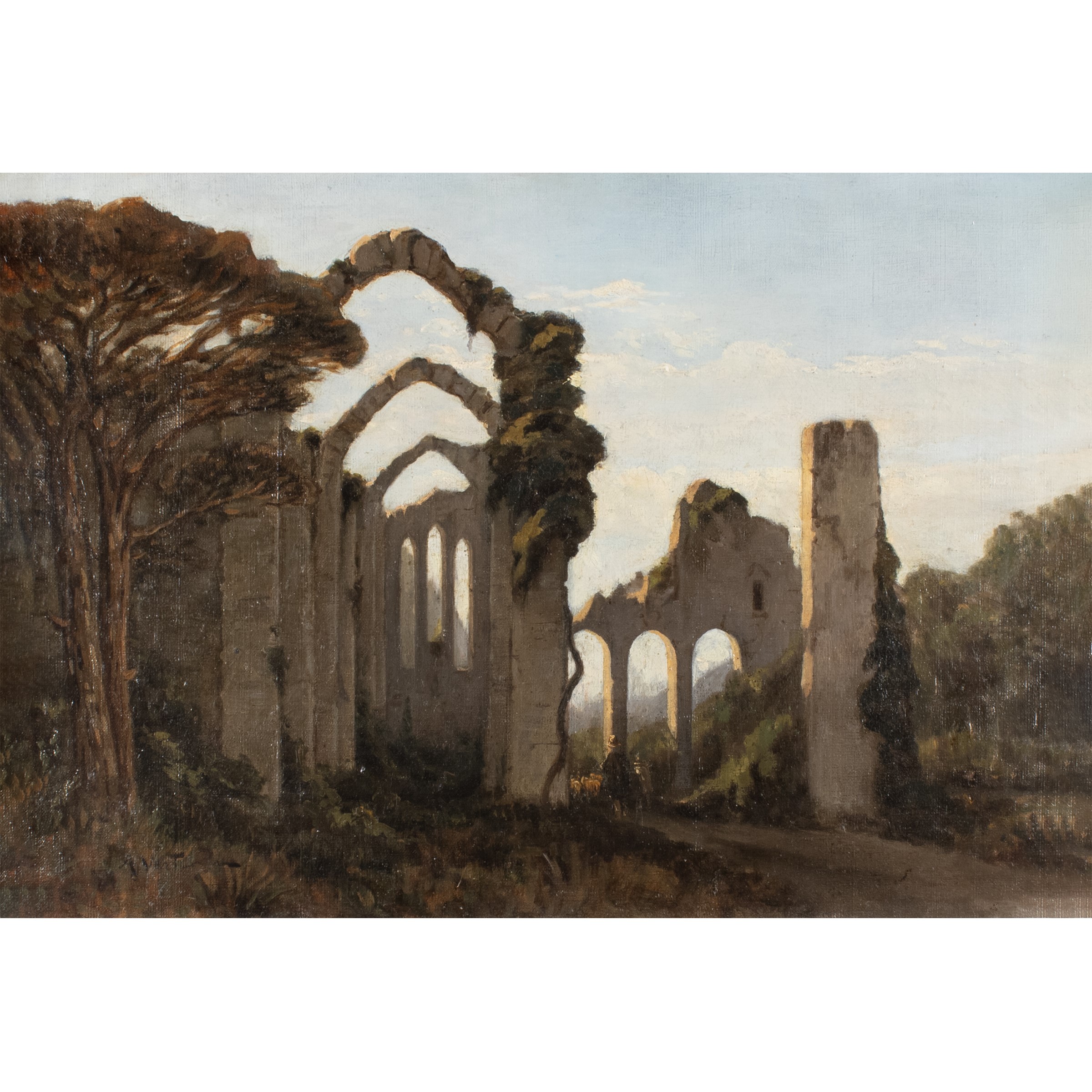 37x53 cm."Veduta con rovine e armenti", olio su tela, firmato in basso a sinistra, entro cornice.