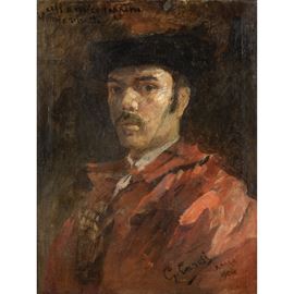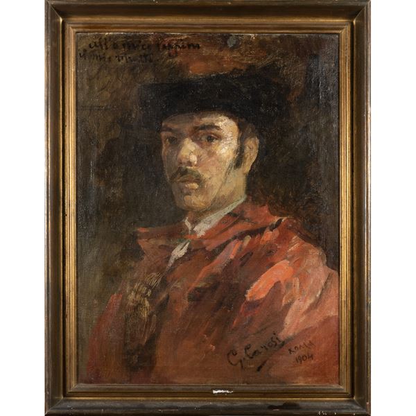 57,5x43 cm."Autoritratto", 1904, olio su tela, firmato e datato in basso a destra, dedica in alto a sinistra "al mio amico Peppino il mio ritratto", entro cornice