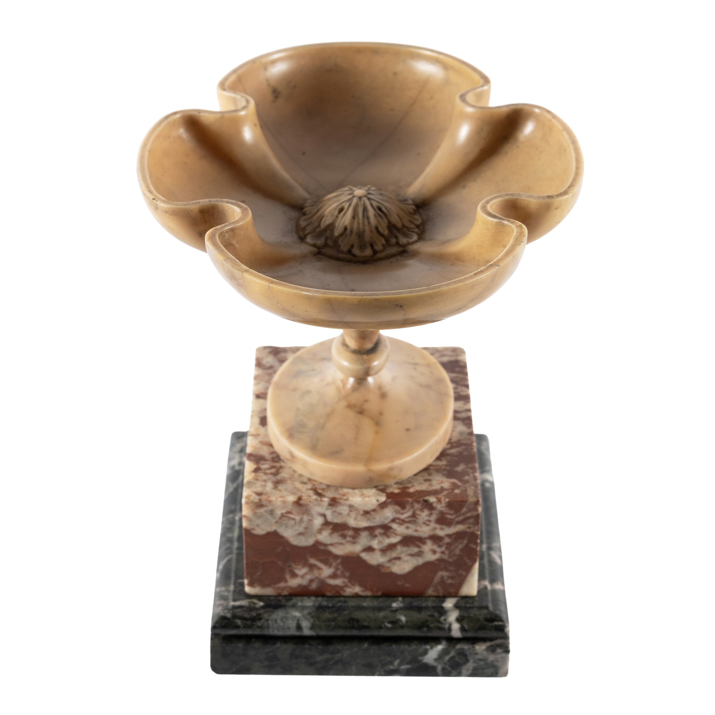 16,5x18,5x12,5 cm.vasca ovale con profilo mosso e rosetta centrale al centro, poggiante su base squadrata in marmi diversi