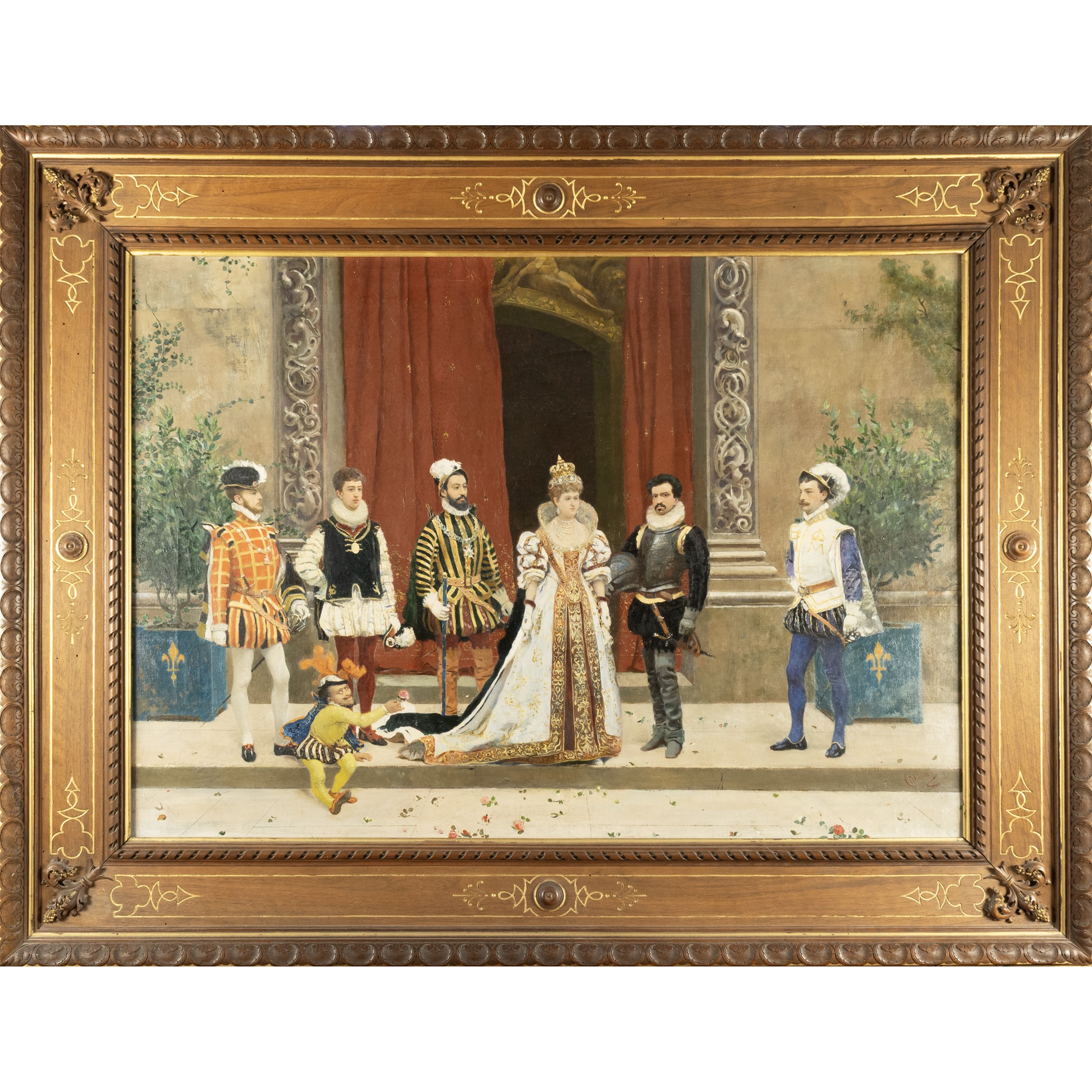 100x70 cm."Ballo in costume a Palazzo Caetani, Roma", olio su tela, firmato in basso a destra, entro cornice.