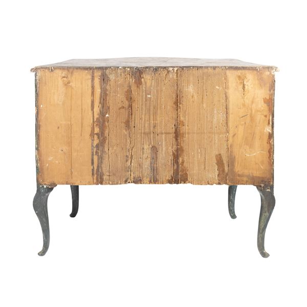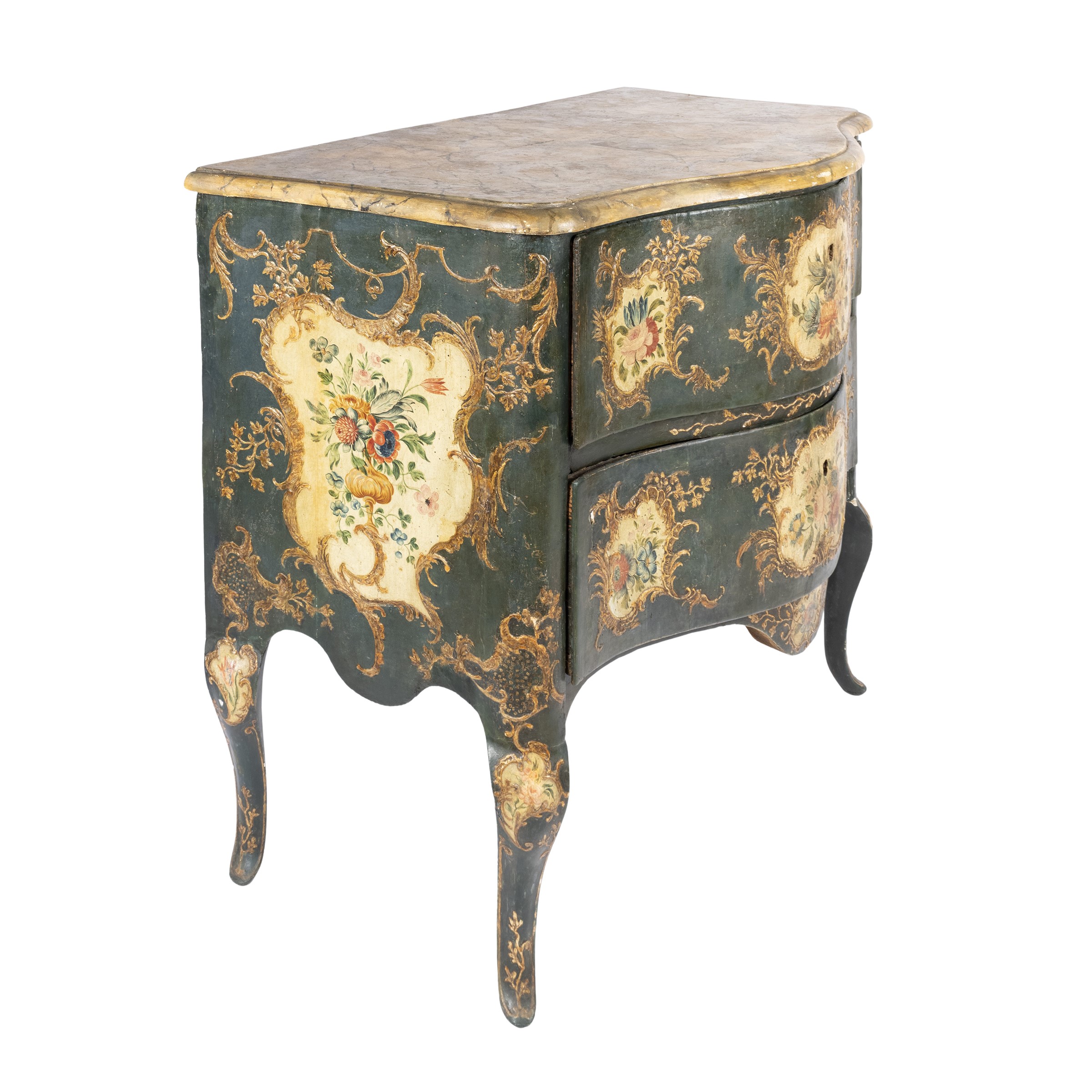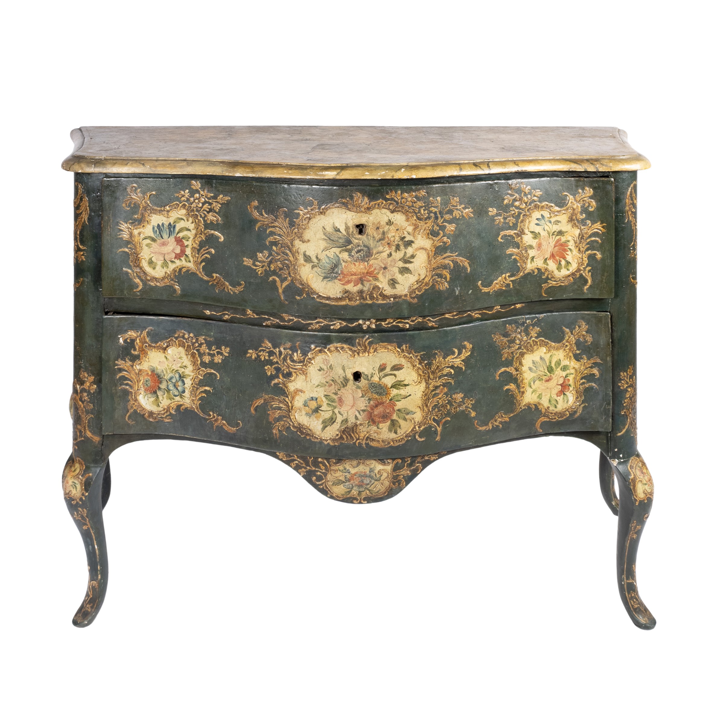 94x116x58 cm.fronte a due cassetti, interamente decorato da composizioni floreali policrome entro cartouche rocaille lavorate in pastiglia, gambe e grembiali mossi, piano sagomato in legno lavorato a finto marmo, usure e difetti.