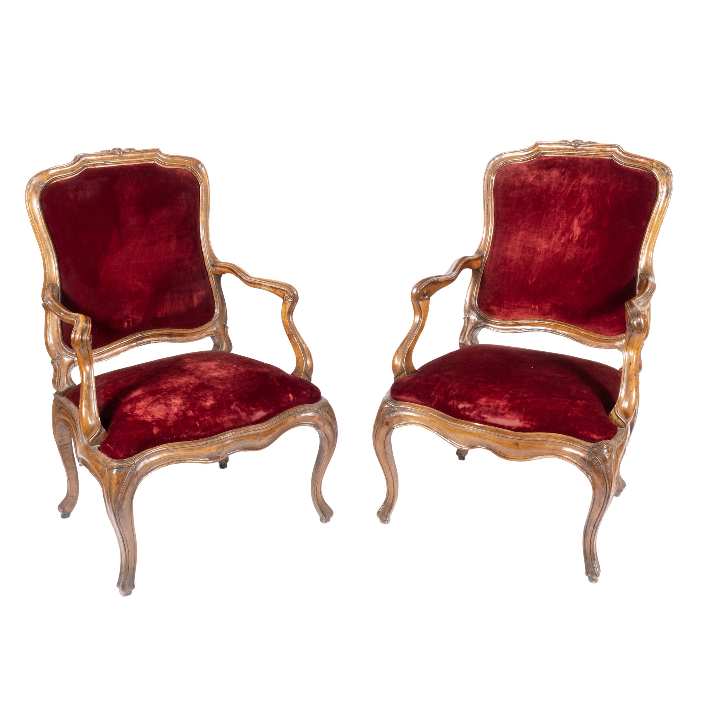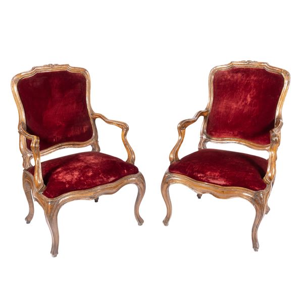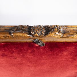 105x68x56 cm.struttura mistilinea con braccioli e gambe a ricciolo, cimasa ornata da elementi floreali a rilievo, sedute e schienali imbottiti e rivestiti in tessuto, lievi segni di usura.