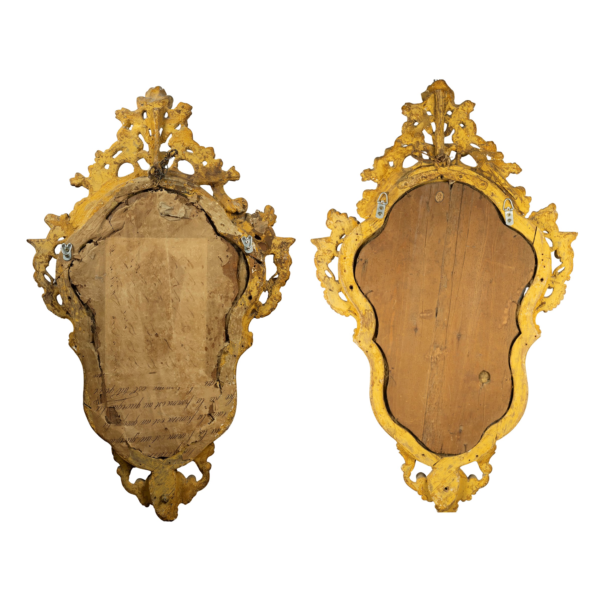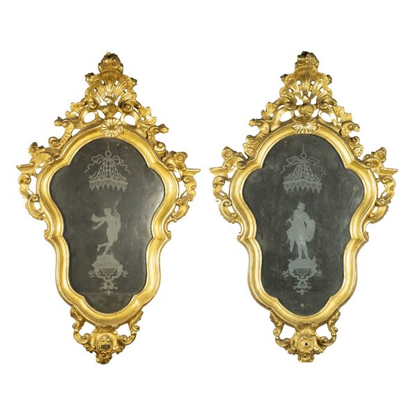 93x56 cm.cornice sagomata e decorata con motivi floreali e volute, specchio centrato da figure classiche, lievi usure