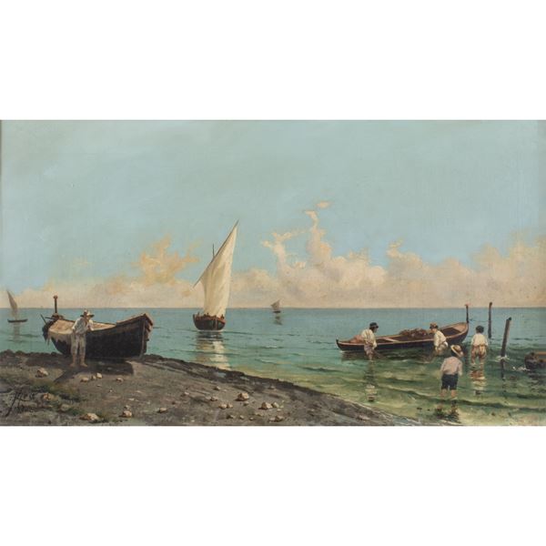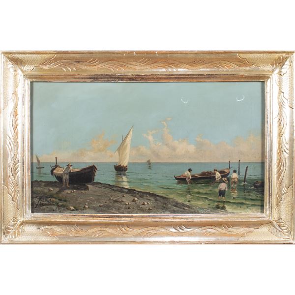 32x56,5 cm."Marina", 1882, olio su tela, firmato e datato in basso a sinistra, entro cornice