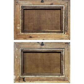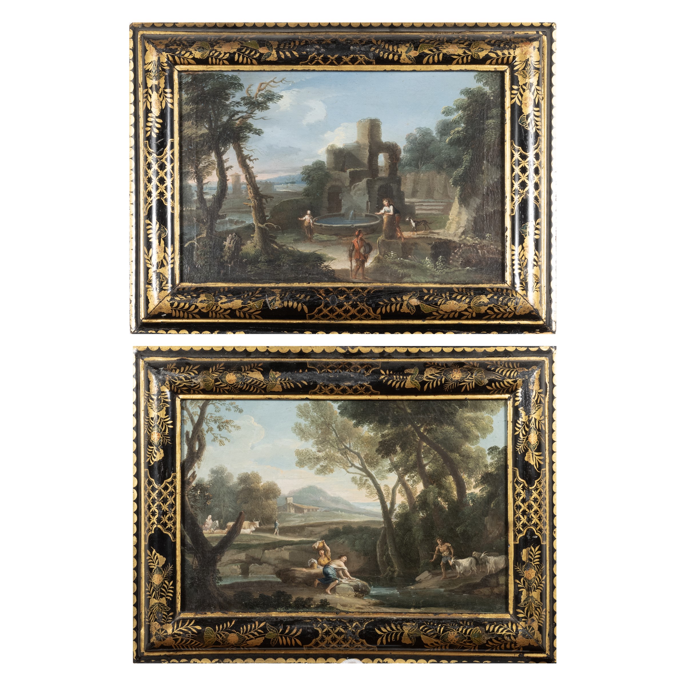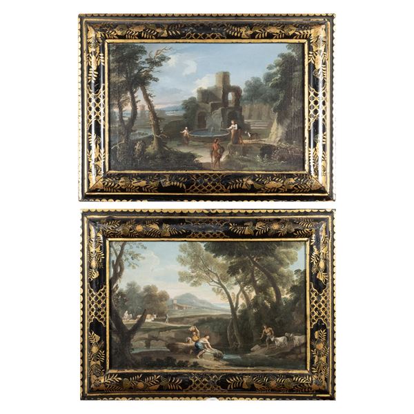 26,5x41 cm."Scene campestri con figure", coppia di oli su tela, entro cornici