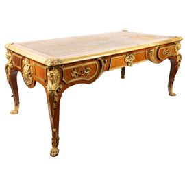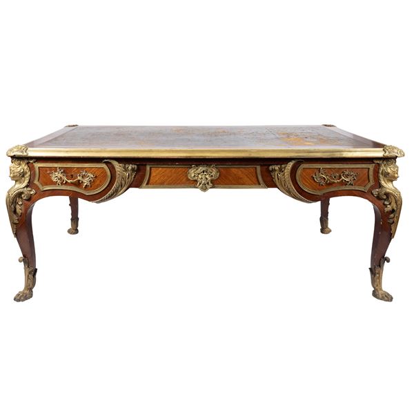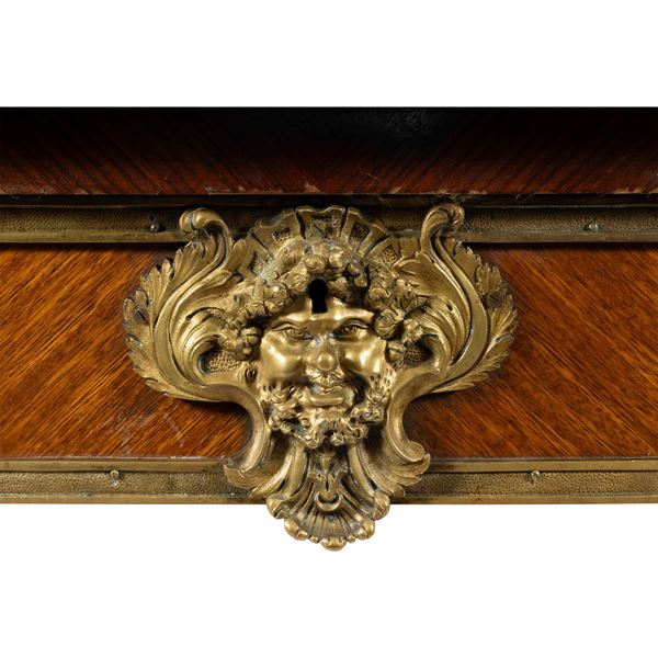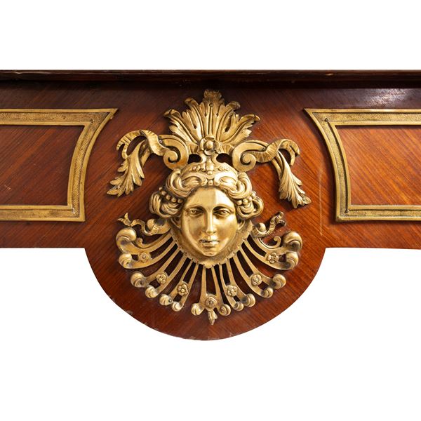 80x200x100 cm.piano sagomato e centrato da riserva in cuoio, bordo in bronzo dorato, fasce e gambe mosse, tre cassetti sul fronte, montature angolari raffiguranti figure femminili, usure, restauri e mancanze