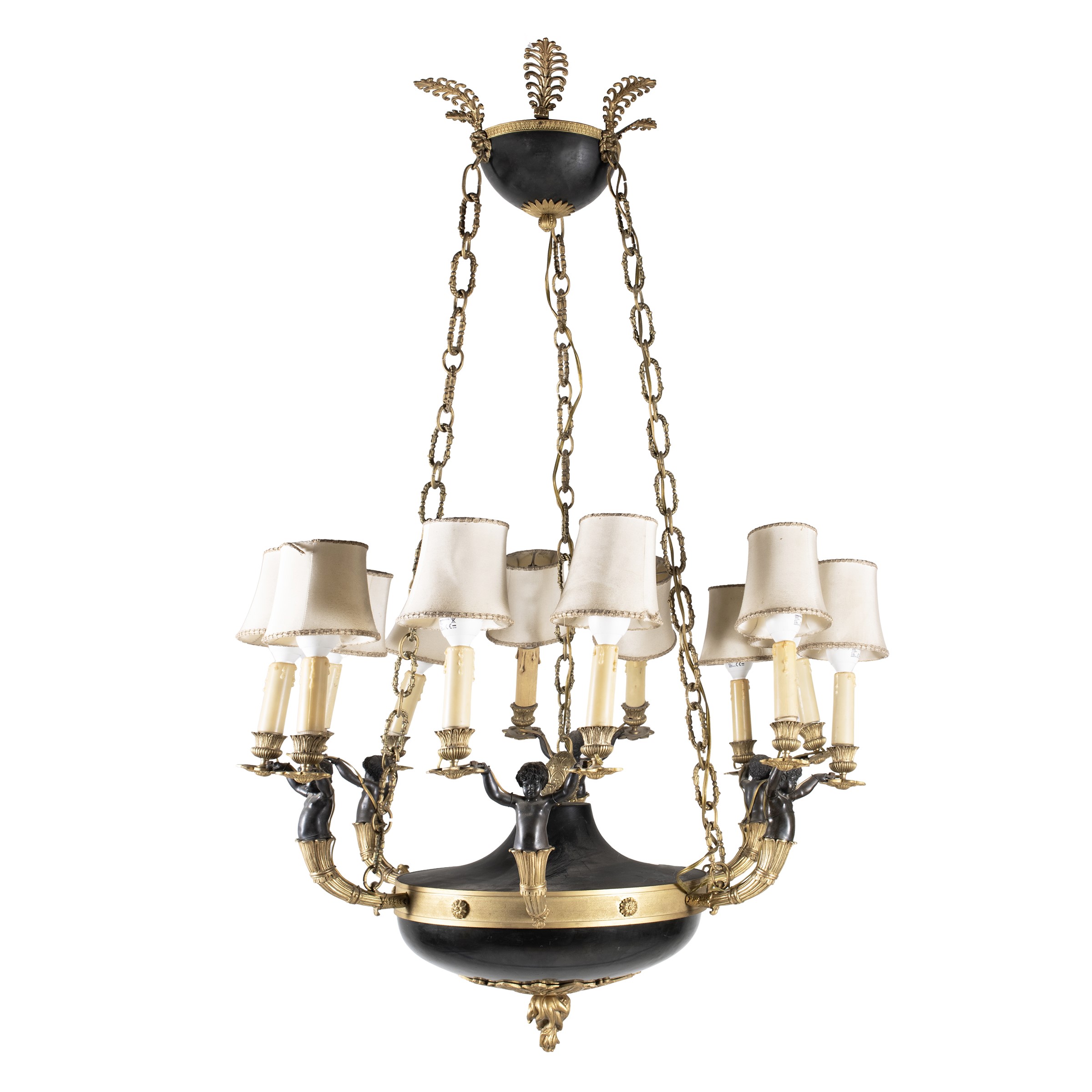 Lampadario di gusto Impero in bronzo dorato e brunito a dodici luci
