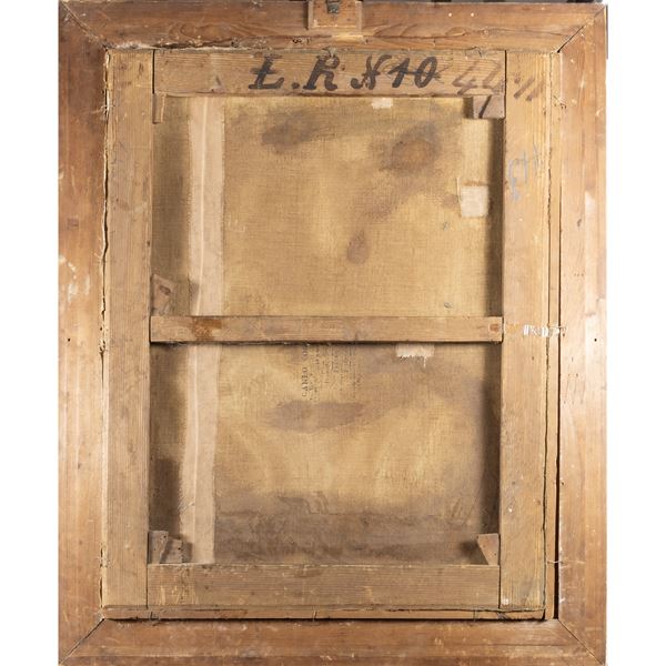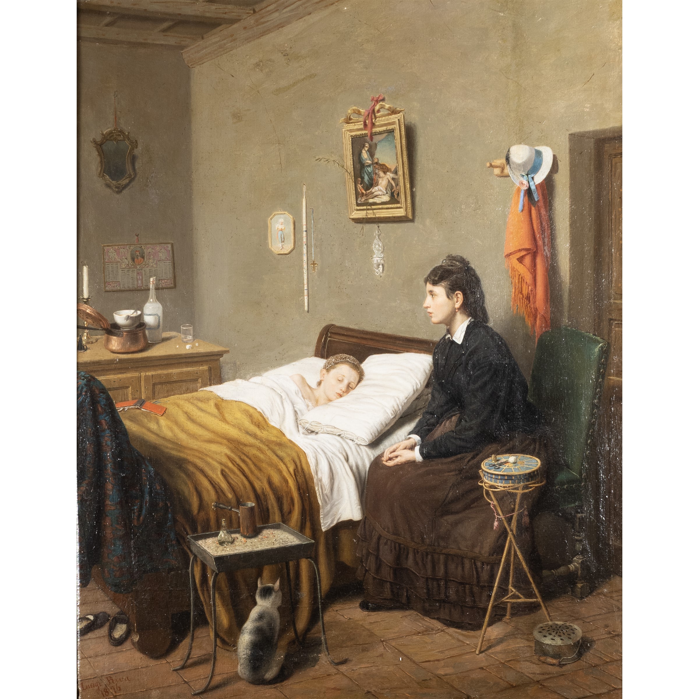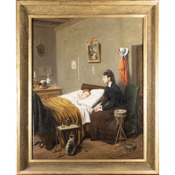 88x70 cm."Al capezzale", 1876, olio su tela, firmato e datato in basso a sinistra, entro cornice.