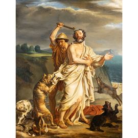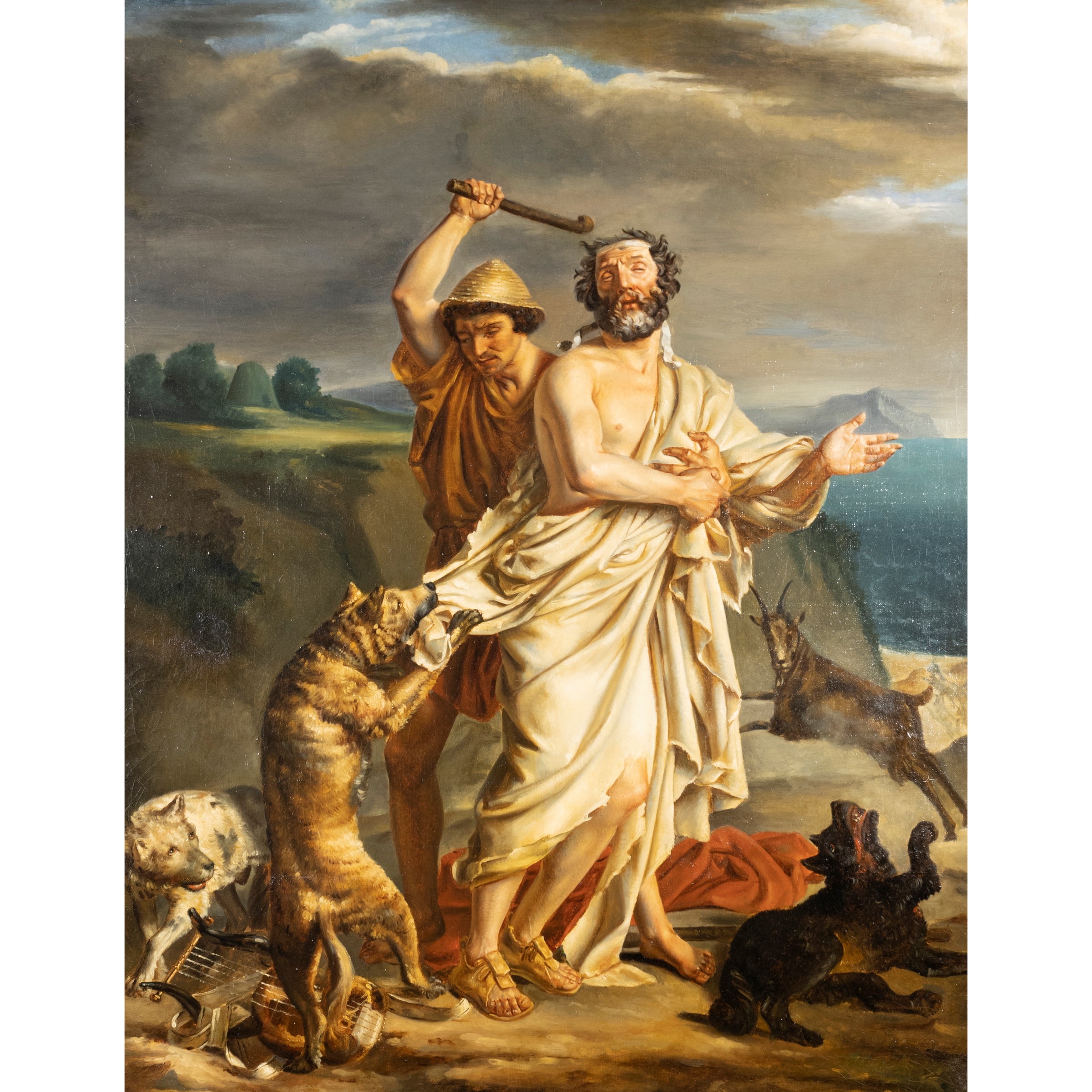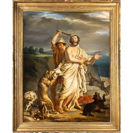 100x80 cm."Omero aggredito dai cani viene aiutato dal pastore Glauco", olio su tela, entro cornice.