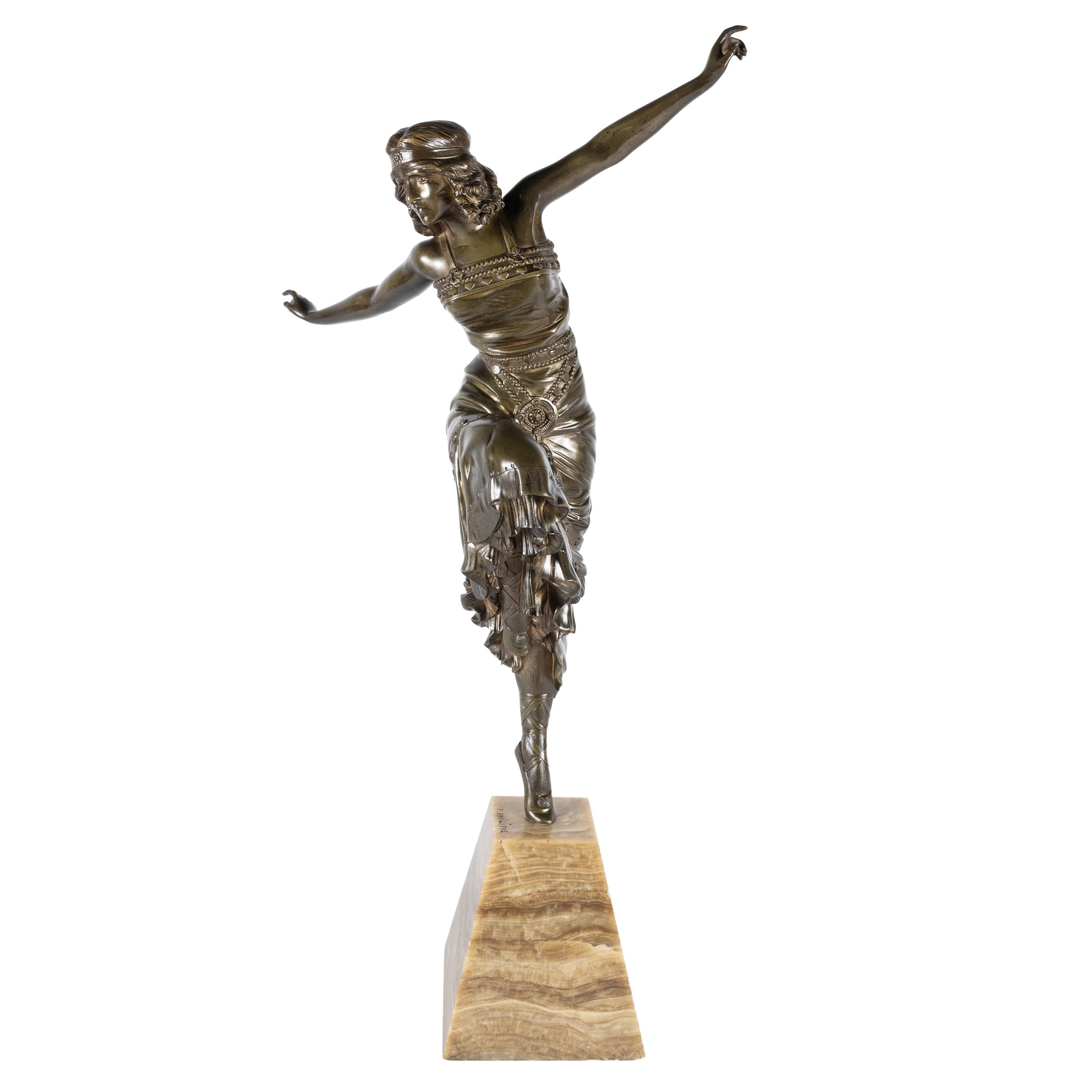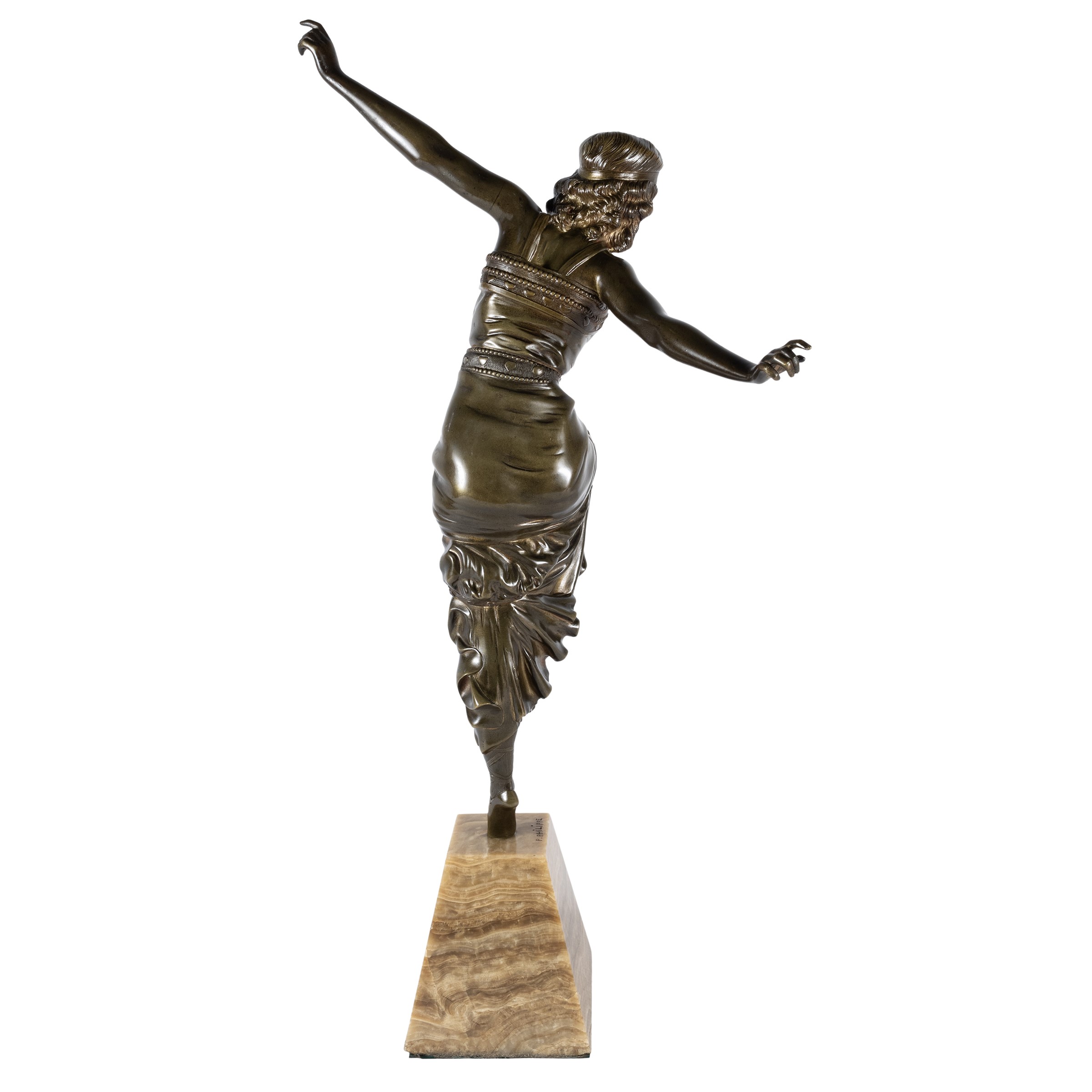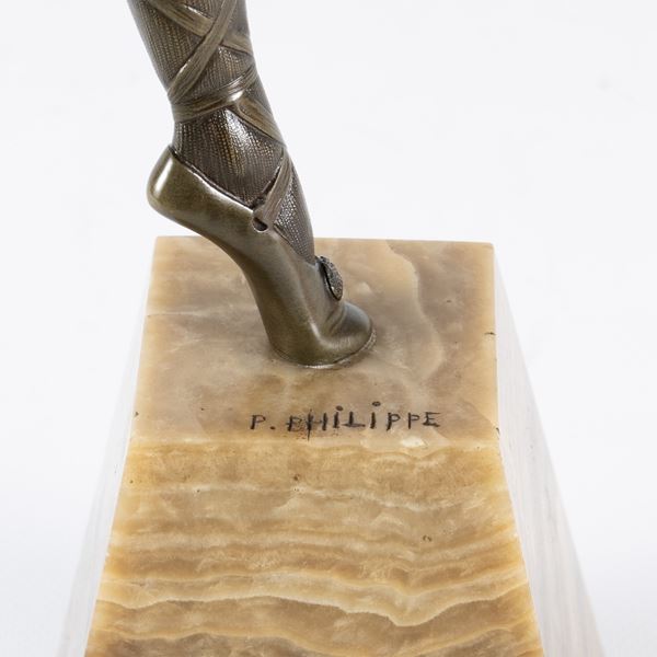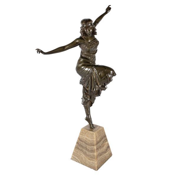 h. 57,5 cm."Ballerina russa", scultura in bronzo brunito poggiante su base in marmo, firmata alla base
