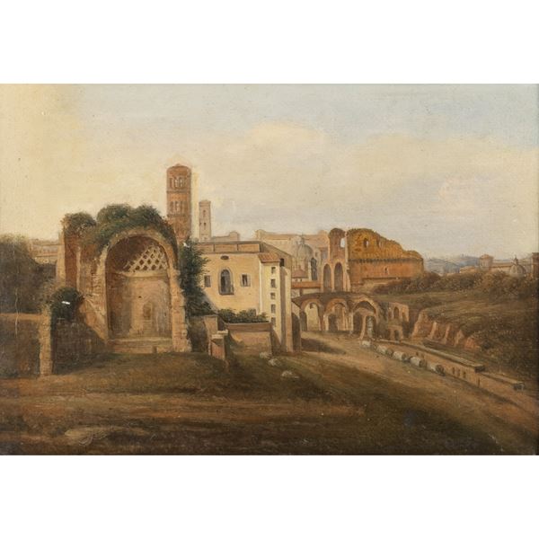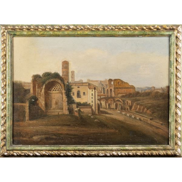 25x35,5 cm."Tempio di Venere a Roma con lo sfondo della Basilica di Massenzio", olio su tela, entro cornice