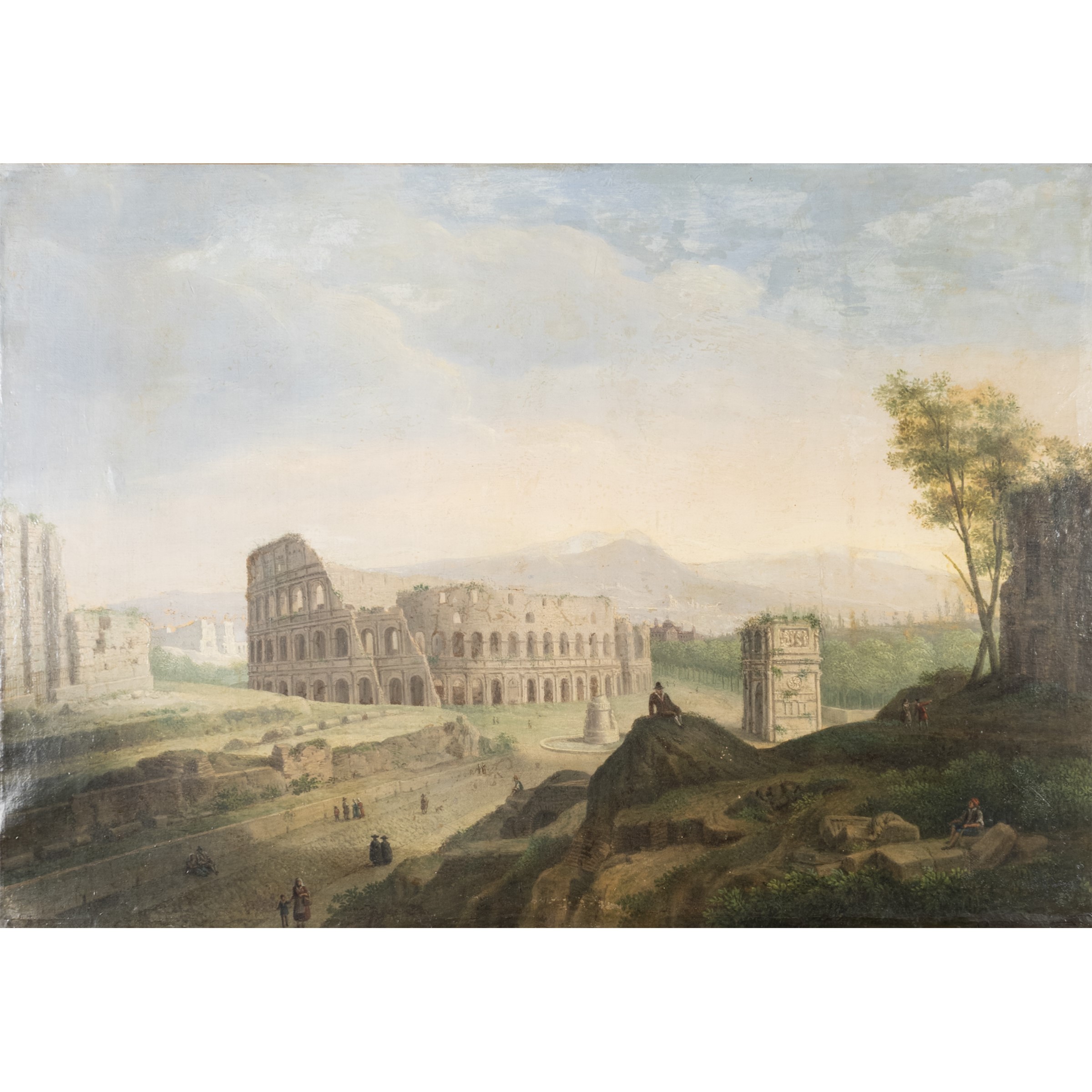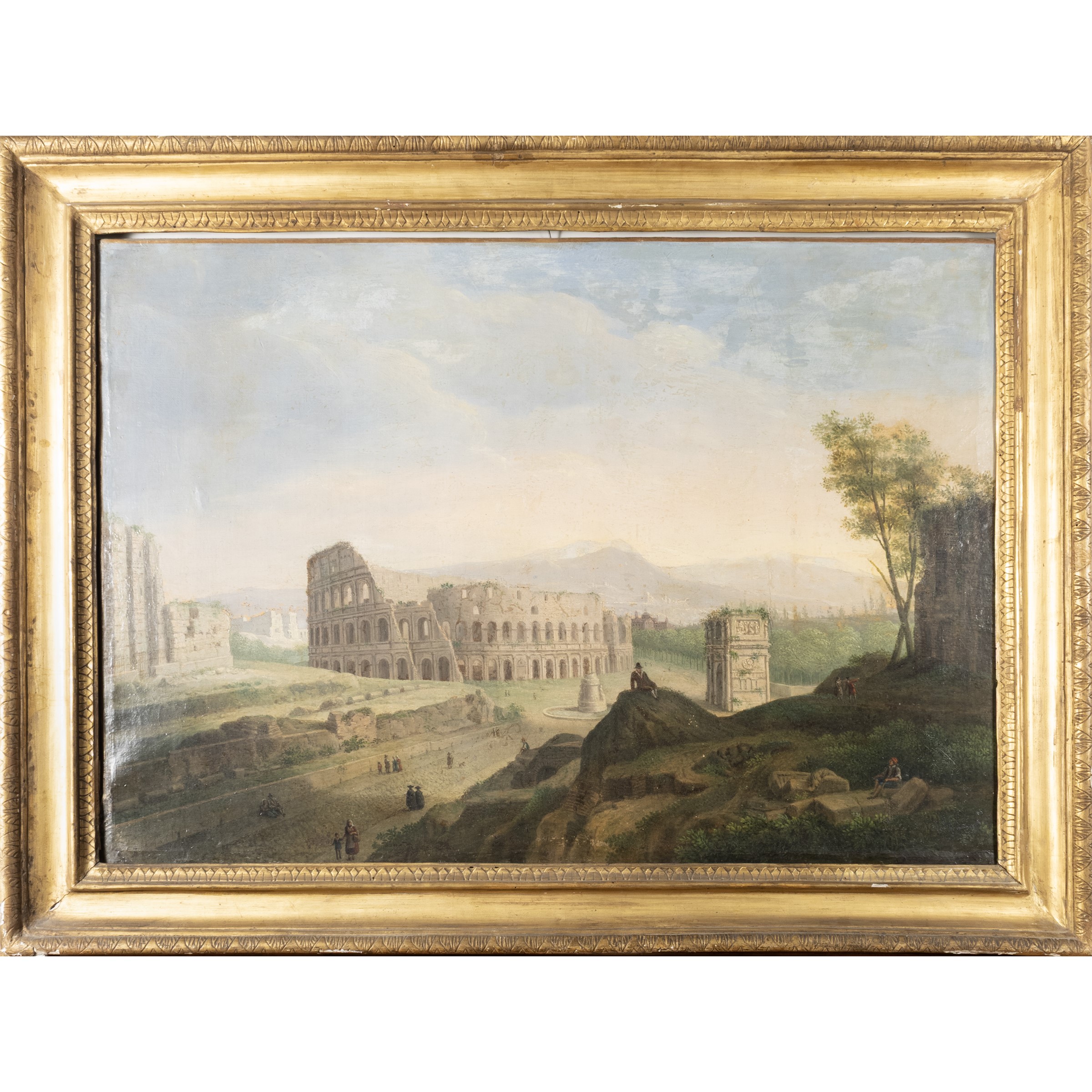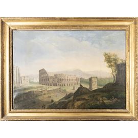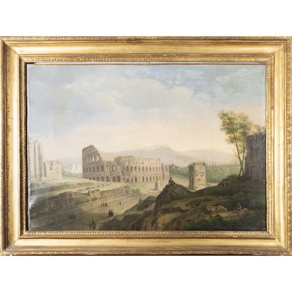 65x93 cm."Veduta del Colosseo con L'Arco di Costantino e la Meta Sudans", olio su tela, entro cornice