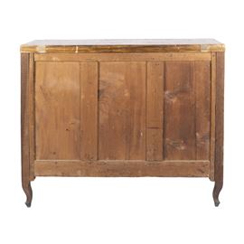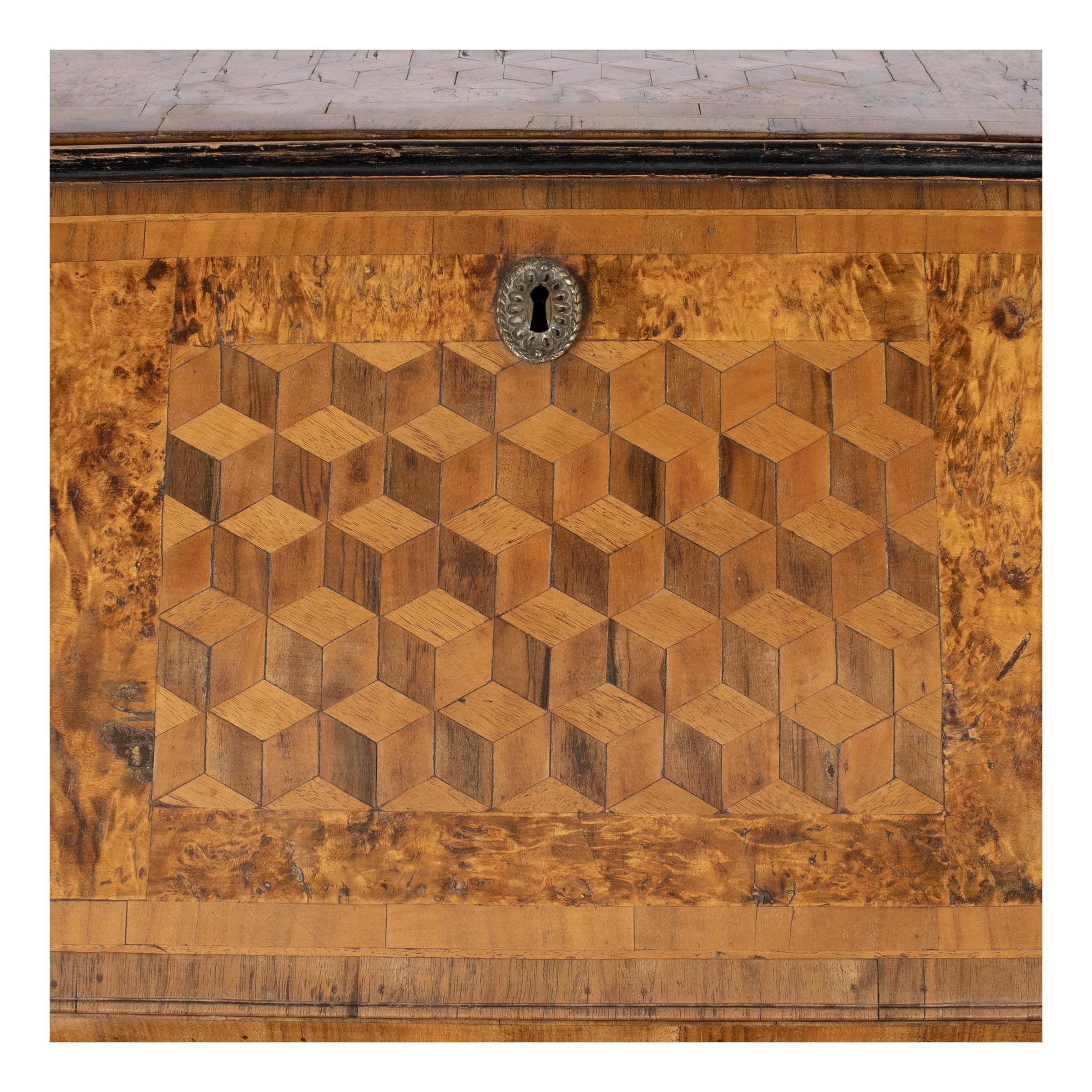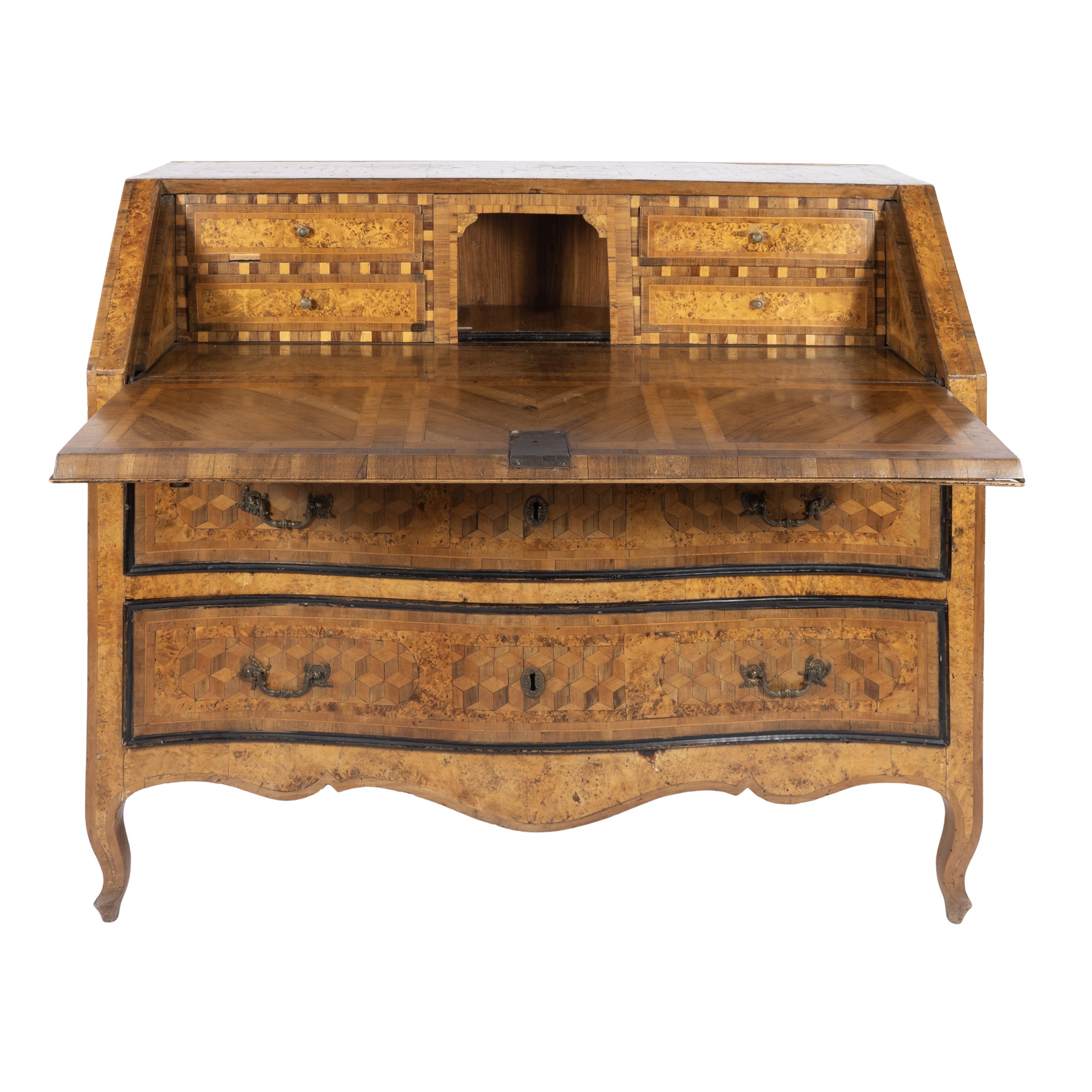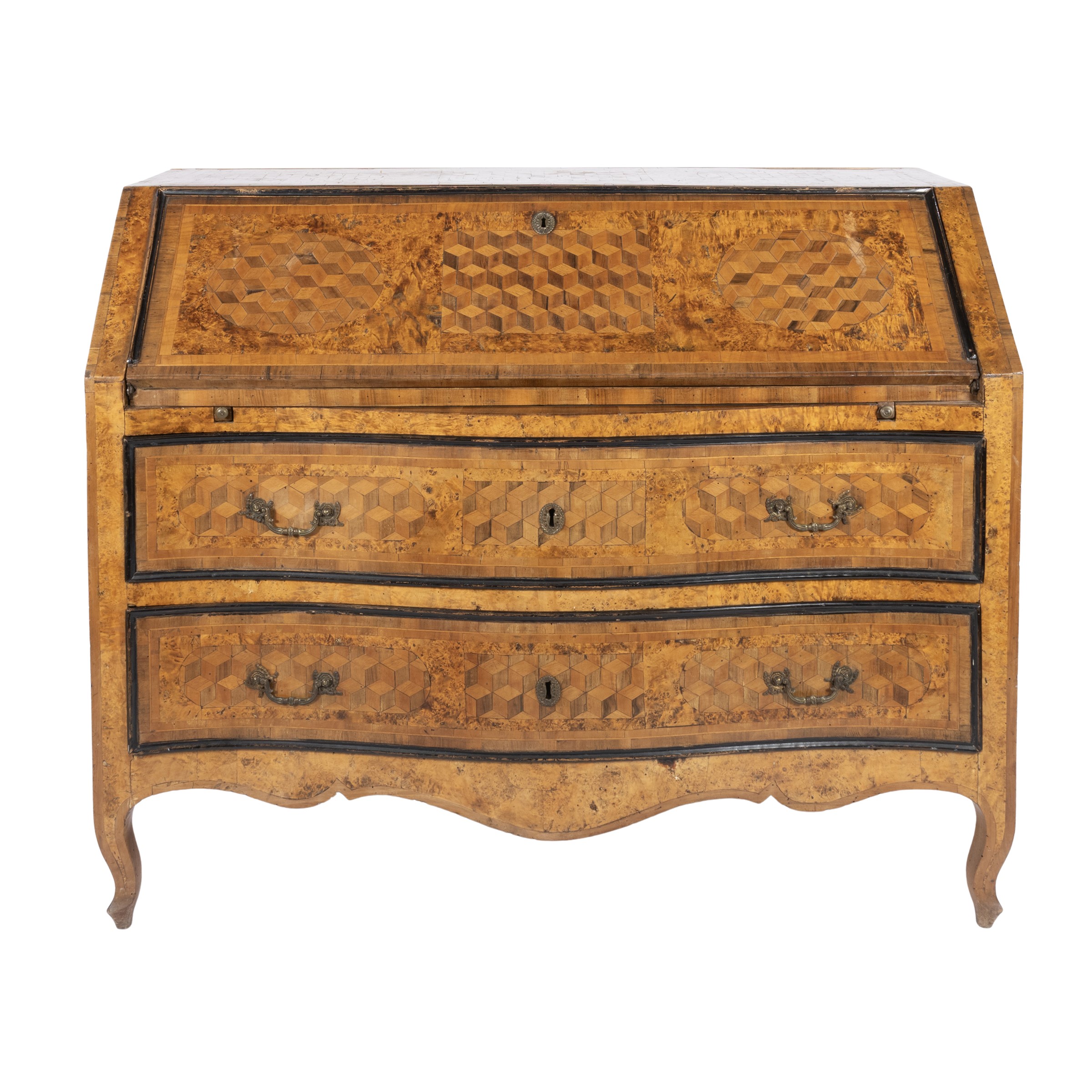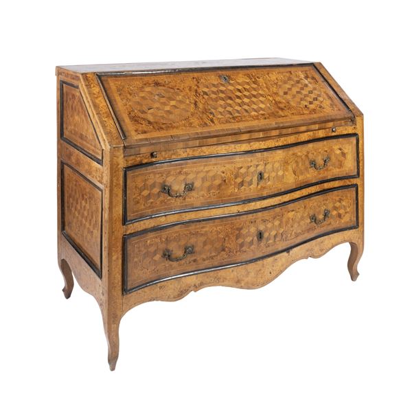 104x127x58 cm.fronte mosso a due cassetti, decoro a motivo geometrico tridimensionale, cornici in legno ebanizzato, anta a calatoia con vano centrale e tiretti vari, maniglie e montature in bronzo dorato, usure e lievi mancanze