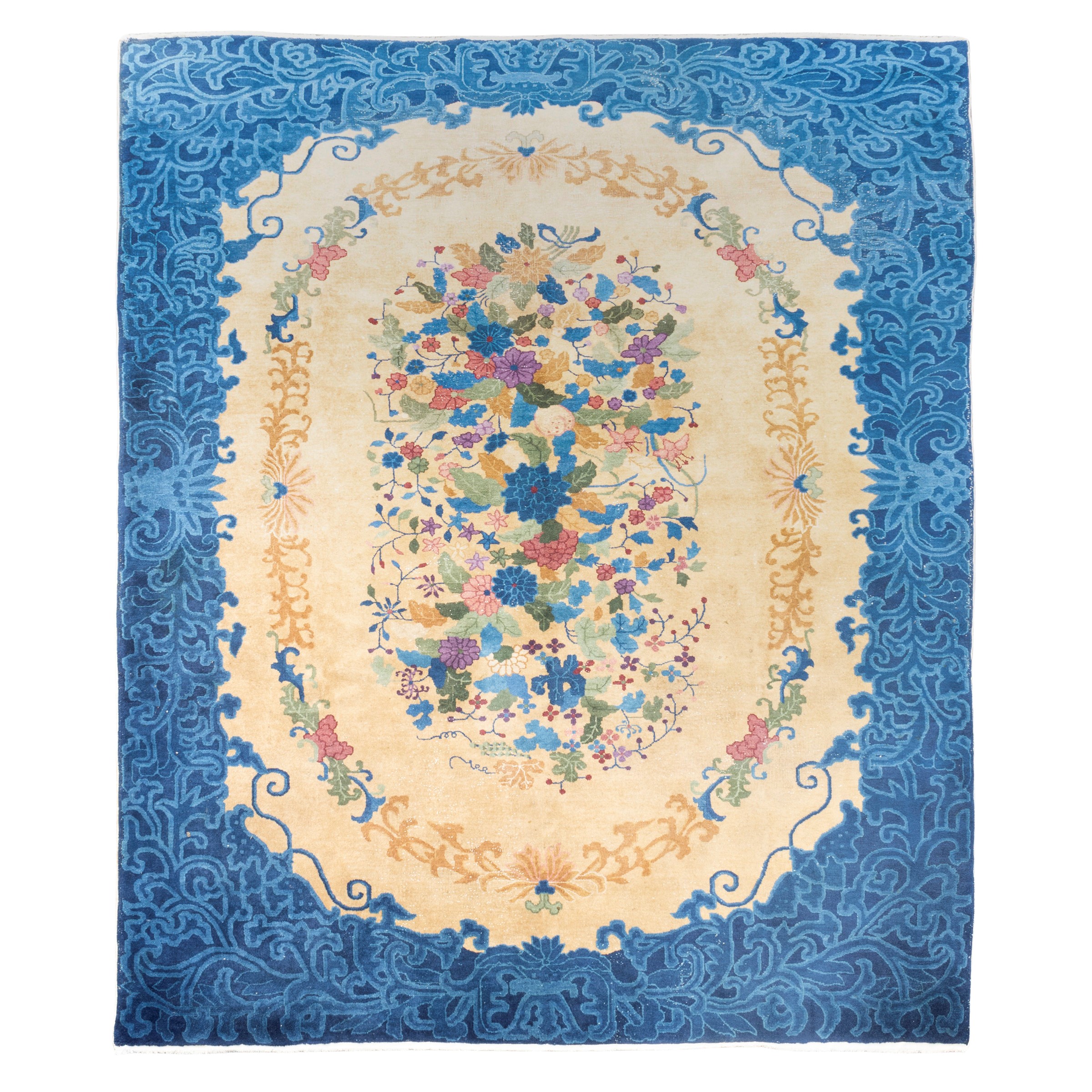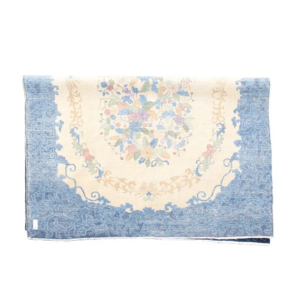 355x270 cm.medaglione centrale con composizione floreale e motivi floreali lungo i bordi, su fondo chiaro e blu, usure e difetti