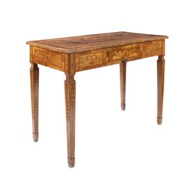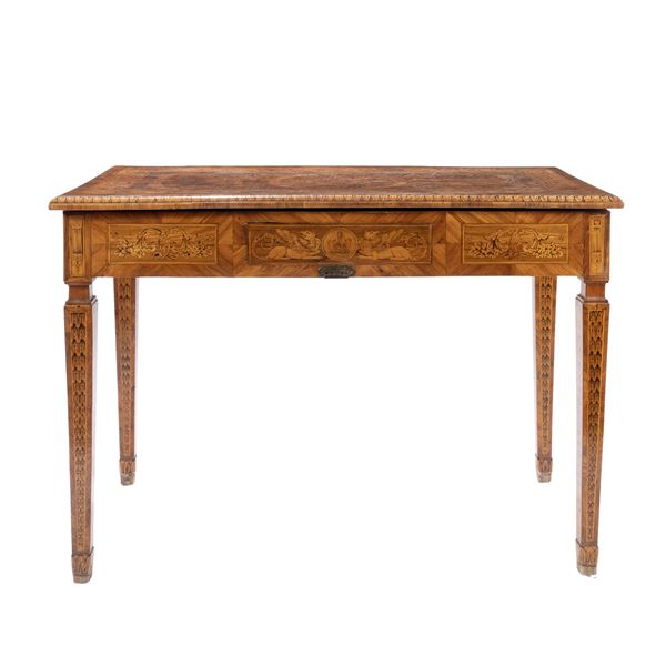 Tavolo scrittoio da centro impiallacciato in legni vari