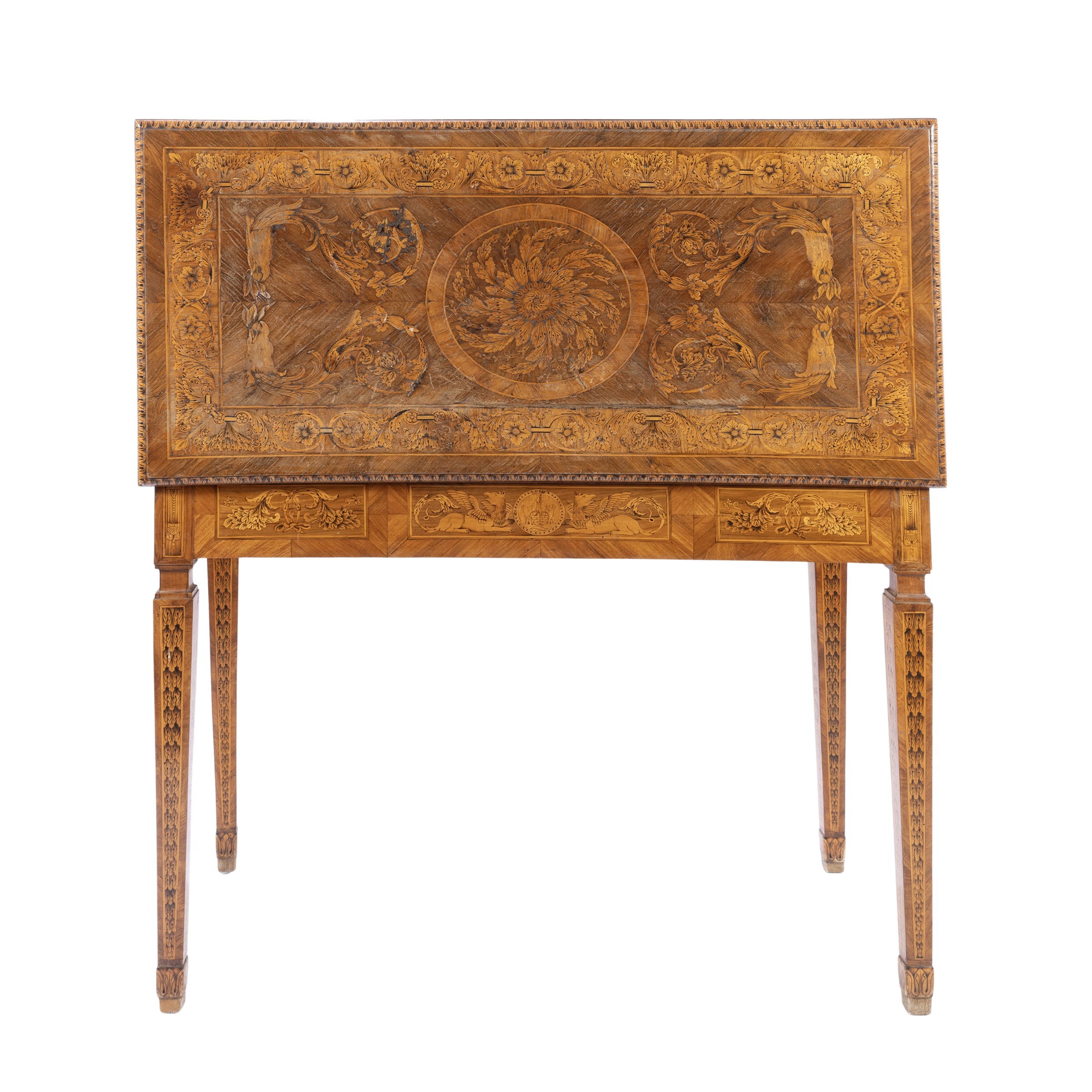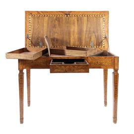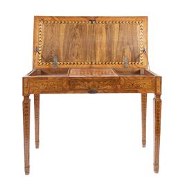 81x106x55 cm.interamente intarsiato e decorato con motivi naturalistici e floreali, piano rettangolare apribile con scomparti e segreti vari all'interno, fascia sottostante centrata da un cassetto, gambe rastremate, usure, difetti e mancanze