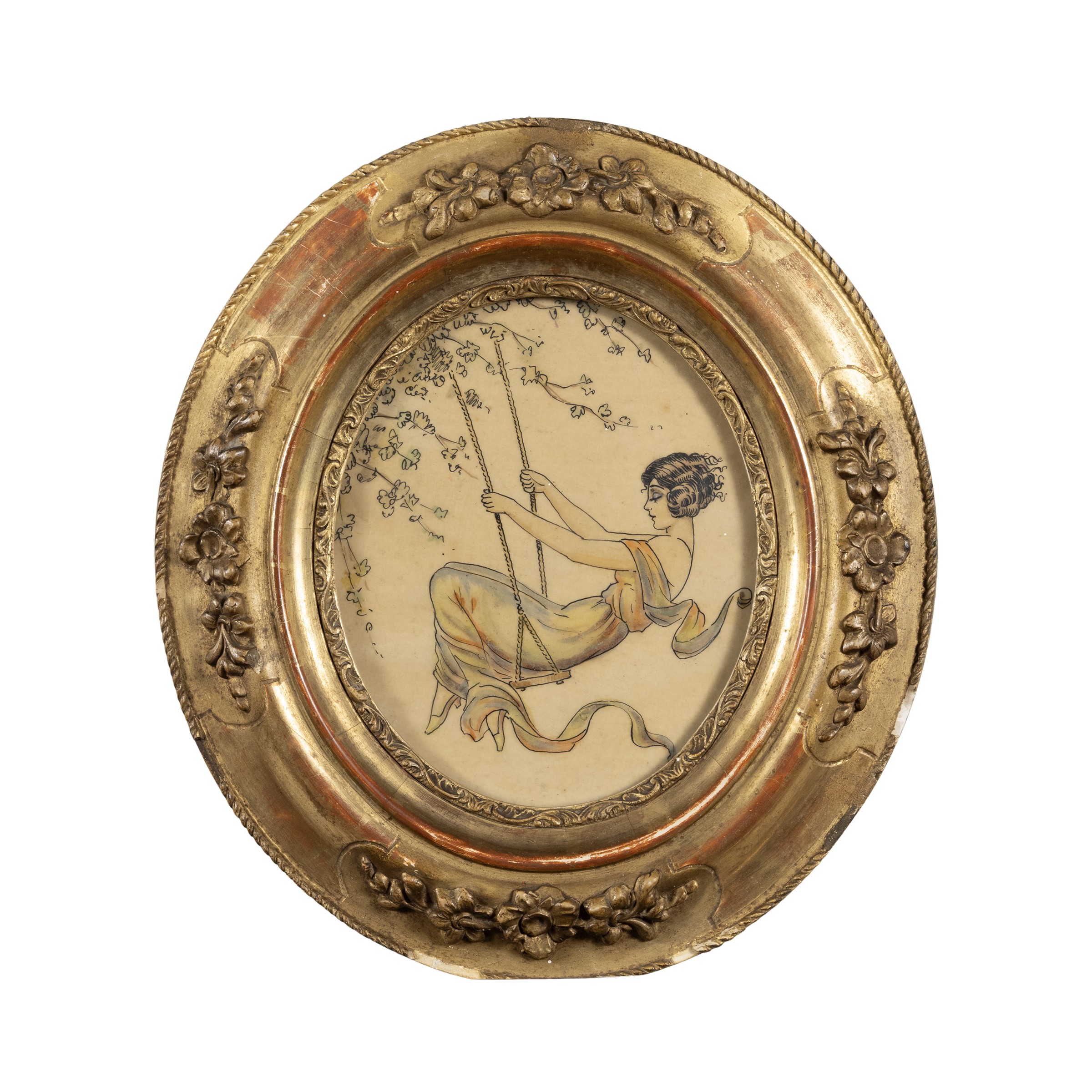 13,5x11,5 cm."Giovane sull'altalena", tecnica mista su carta, entro cornice