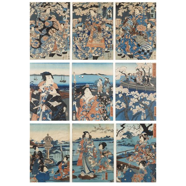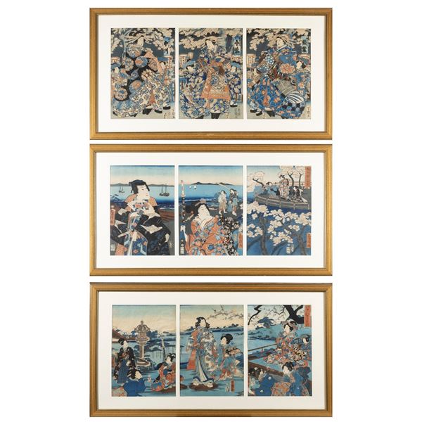 21x15 cm."Paesaggi marini e figure" tre trittici, xilografie a colori, entro cornici