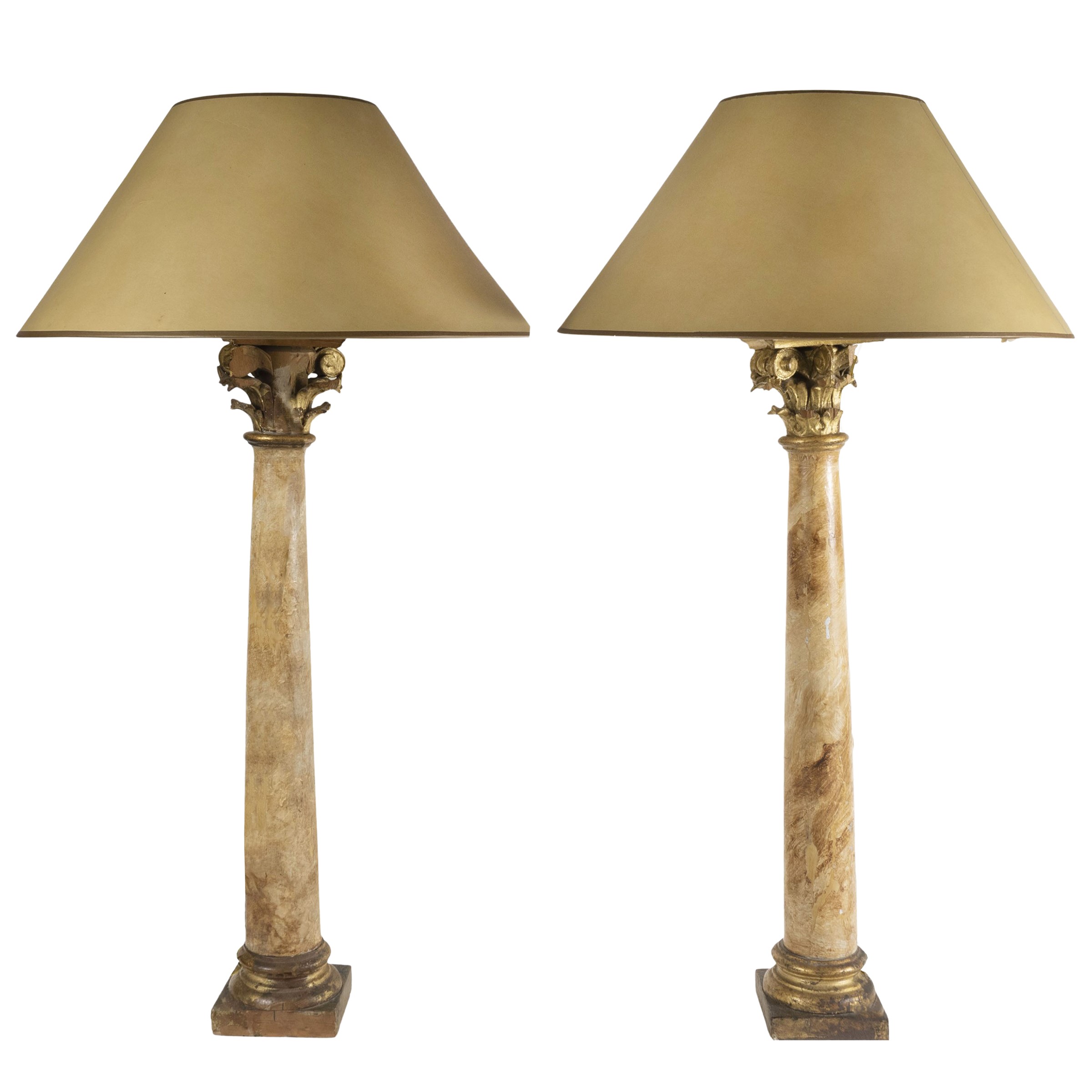 stelo a colonna con capitelli in legno dorato, complete di paralume, lievi usure