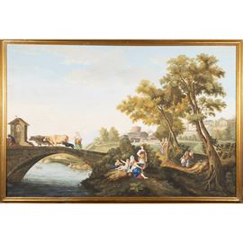 "Paesaggio con ponte, figure e armenti", 1814, olio su carta applicata su tela, firmato e datato in basso a destra