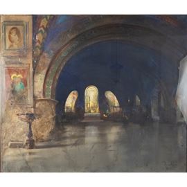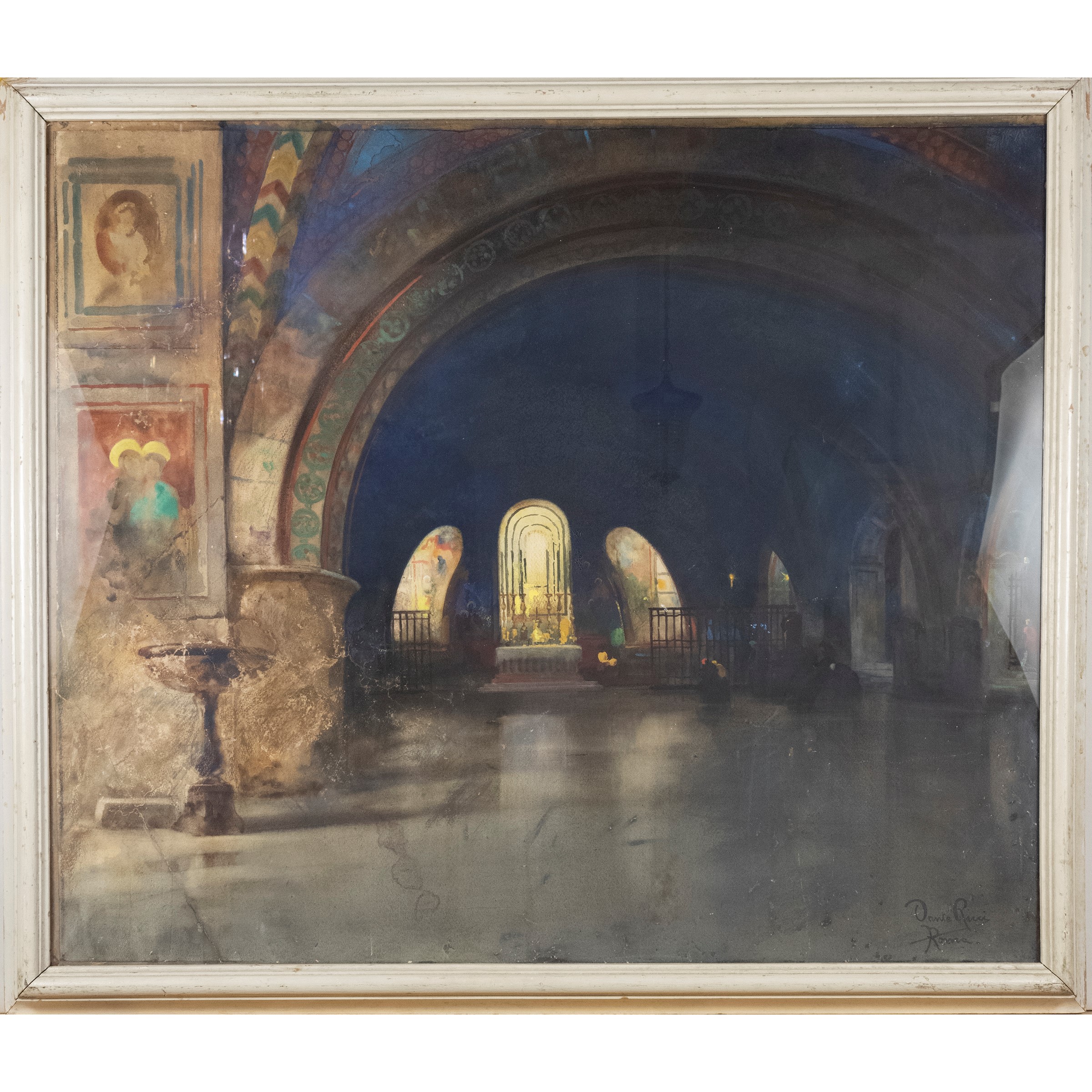 76x90 cm."Interno della Basilica inferiore di San Francesco ad Assisi", acquarello su carta, firmato in basso a destra, entro cornice.