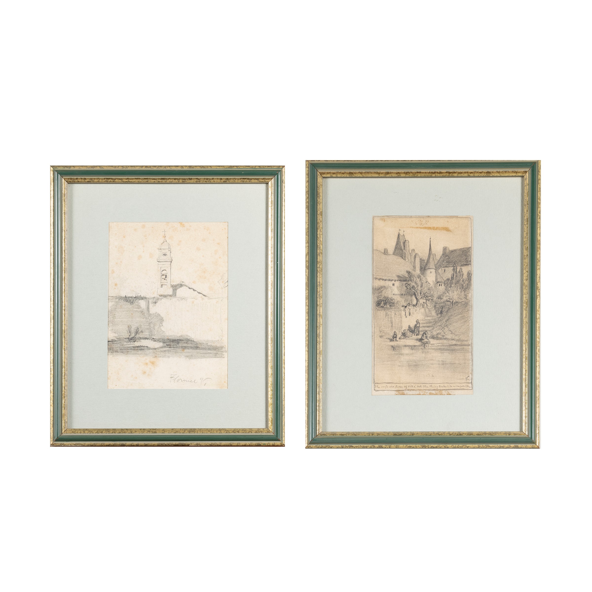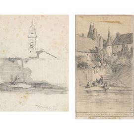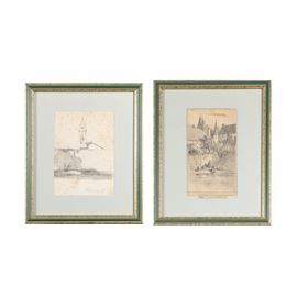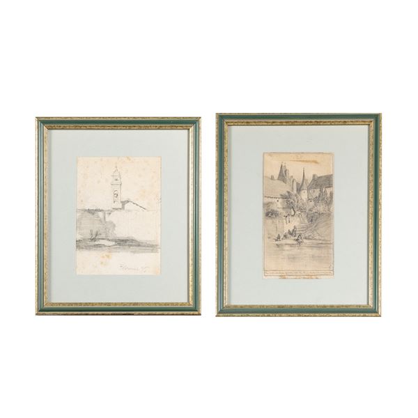 14x10 cm. - 15,5x9 cm."Paesaggi", coppia di disegni a matita e carboncino su carta, siglati in basso a destra, entro cornici
