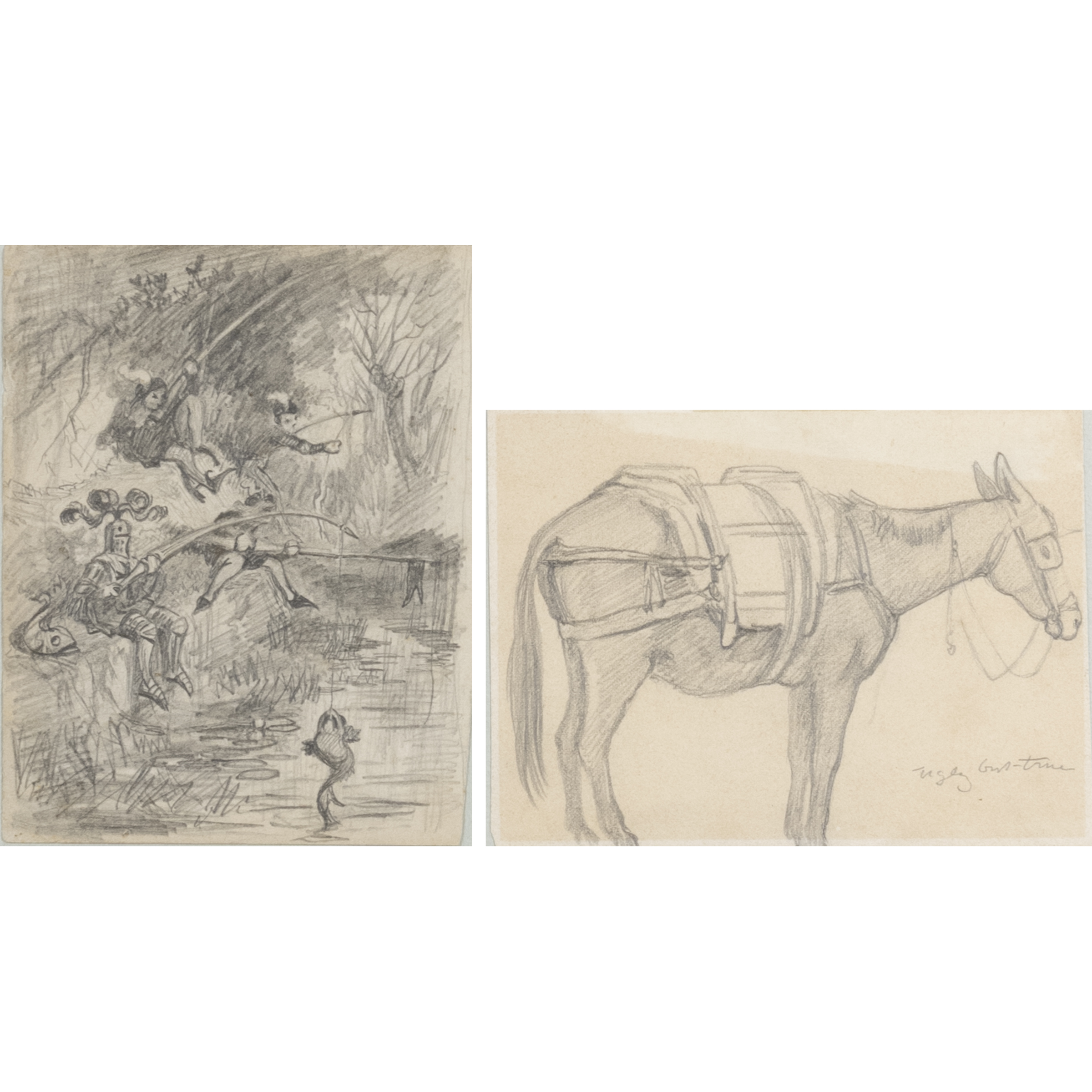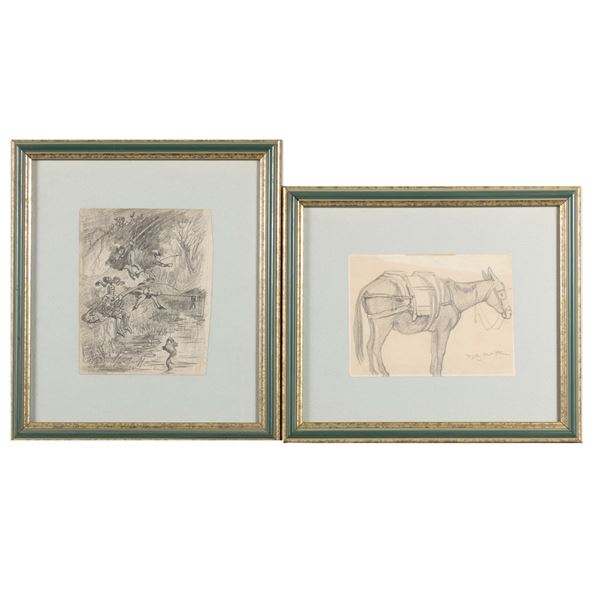 12x9 cm. - 9x12 cm."Pescatori e mulo", coppia di disegni a matita e carboncino su carta, entro cornici
