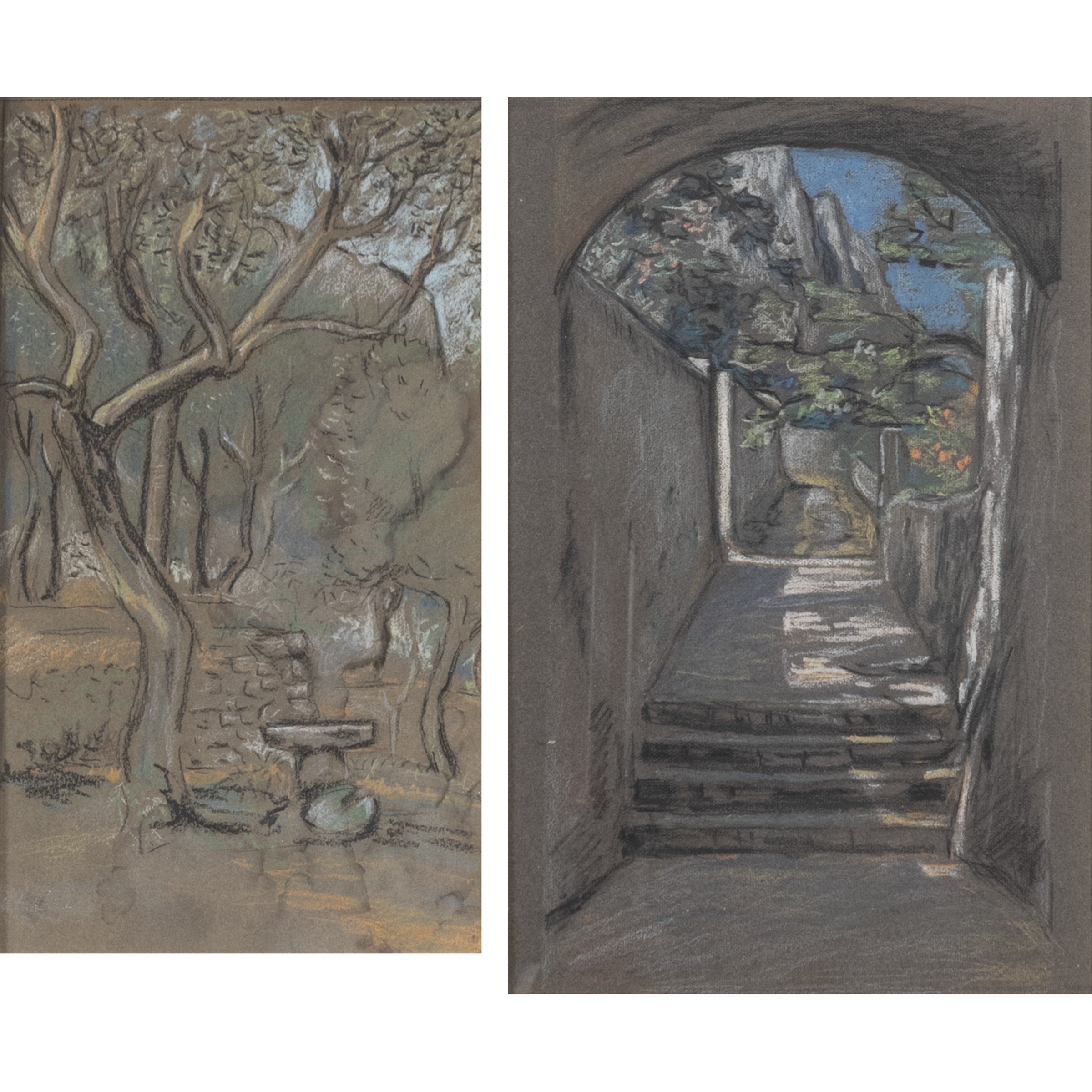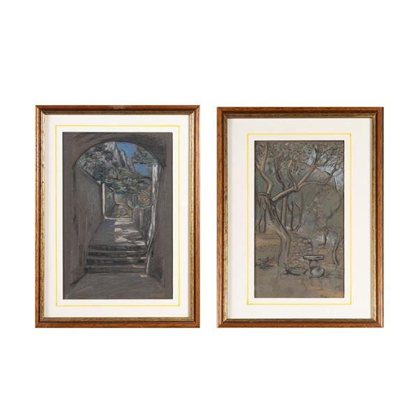 20x12,5 cm. - 20x11 cm."Vedute di Capri", coppia di pastelli e carboncino su carta, entro cornici