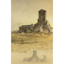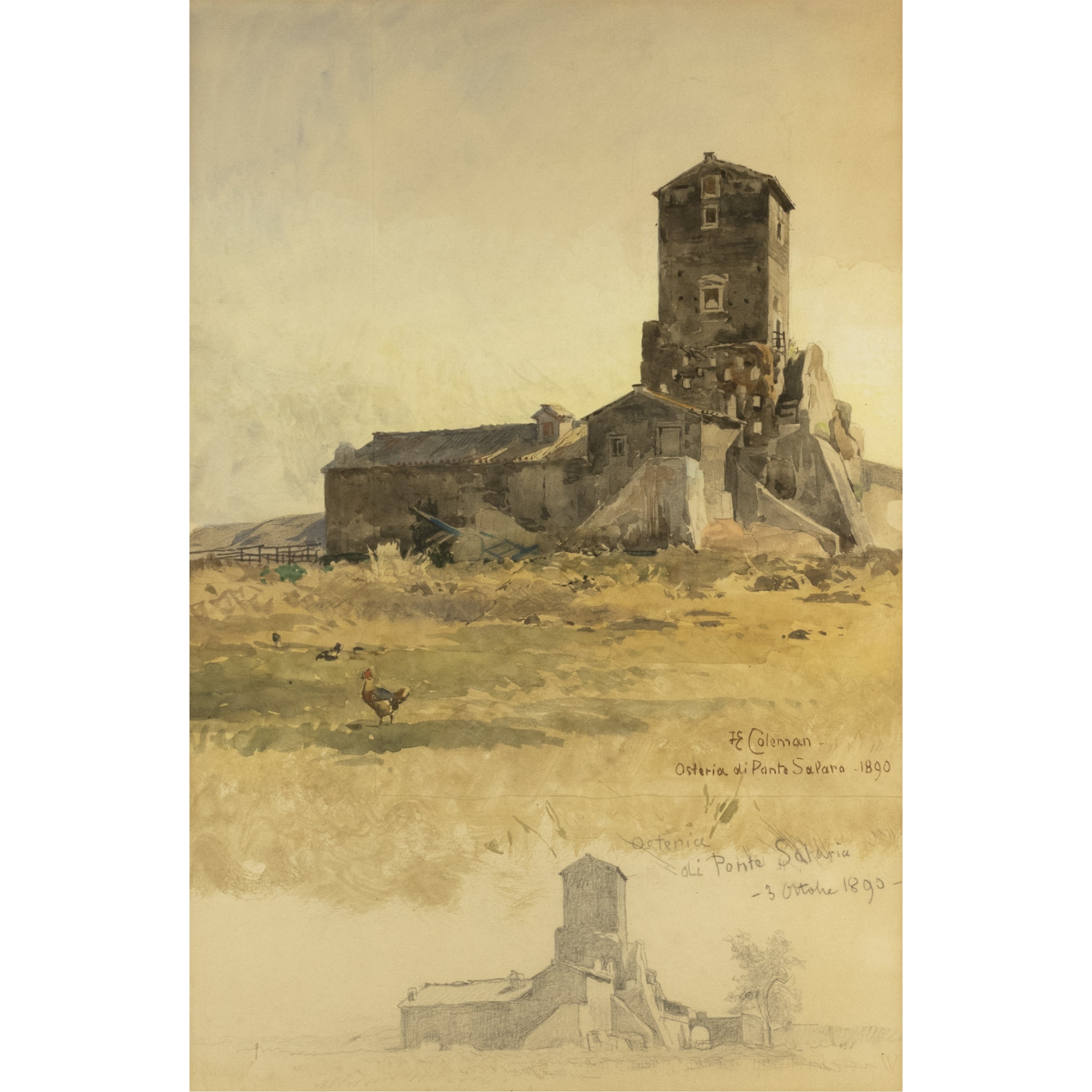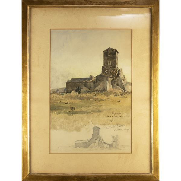 46x30,5 cm."Osteria di ponte Salaria", 1890, acquerello e matita su carta, firmato in basso a destra, entro cornice