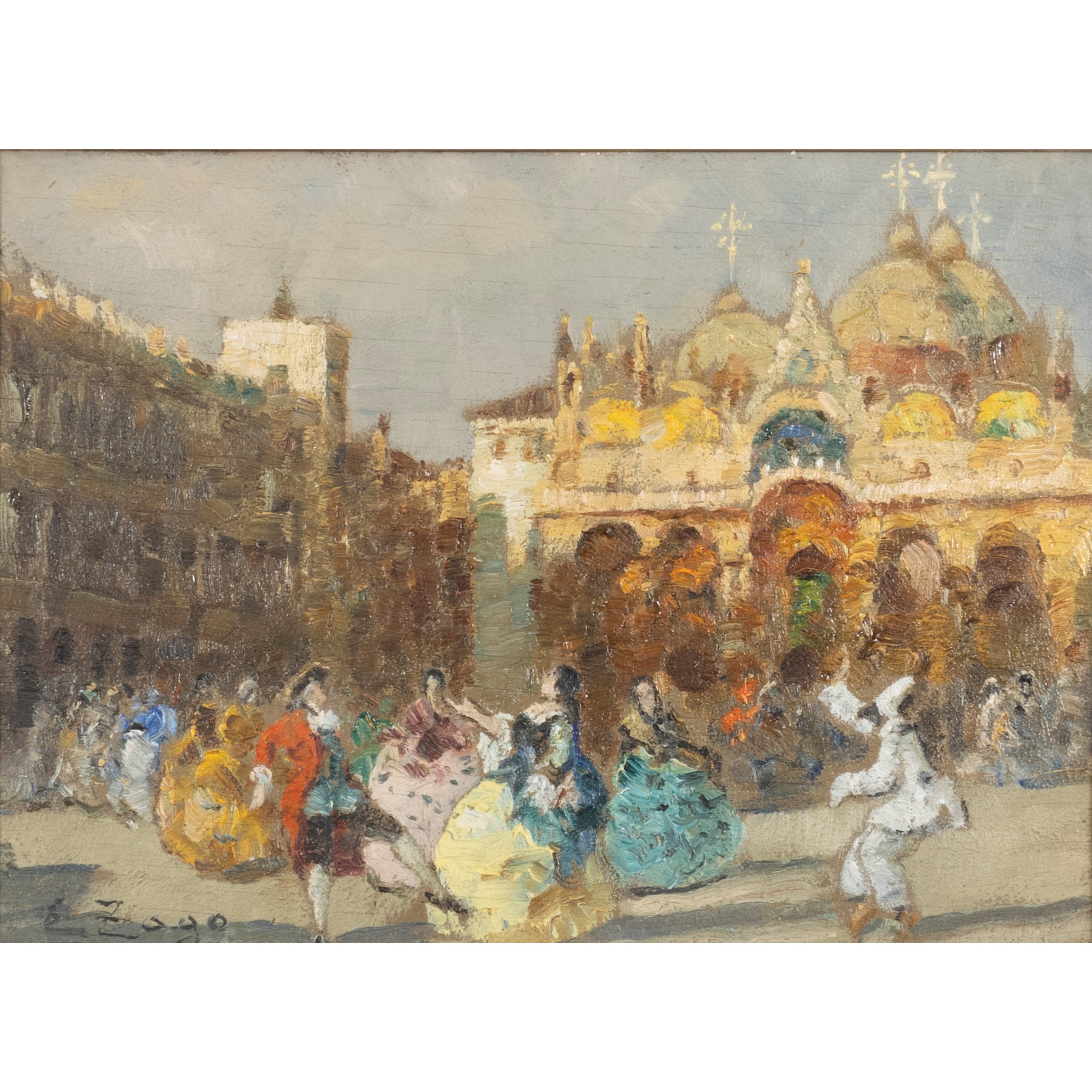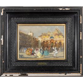 18,5x26,5 cm."Carnevale in piazza San Marco a Venezia", olio su tavoletta, firmato in basso a sinistra, entro cornice