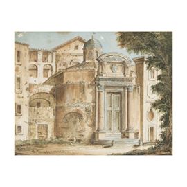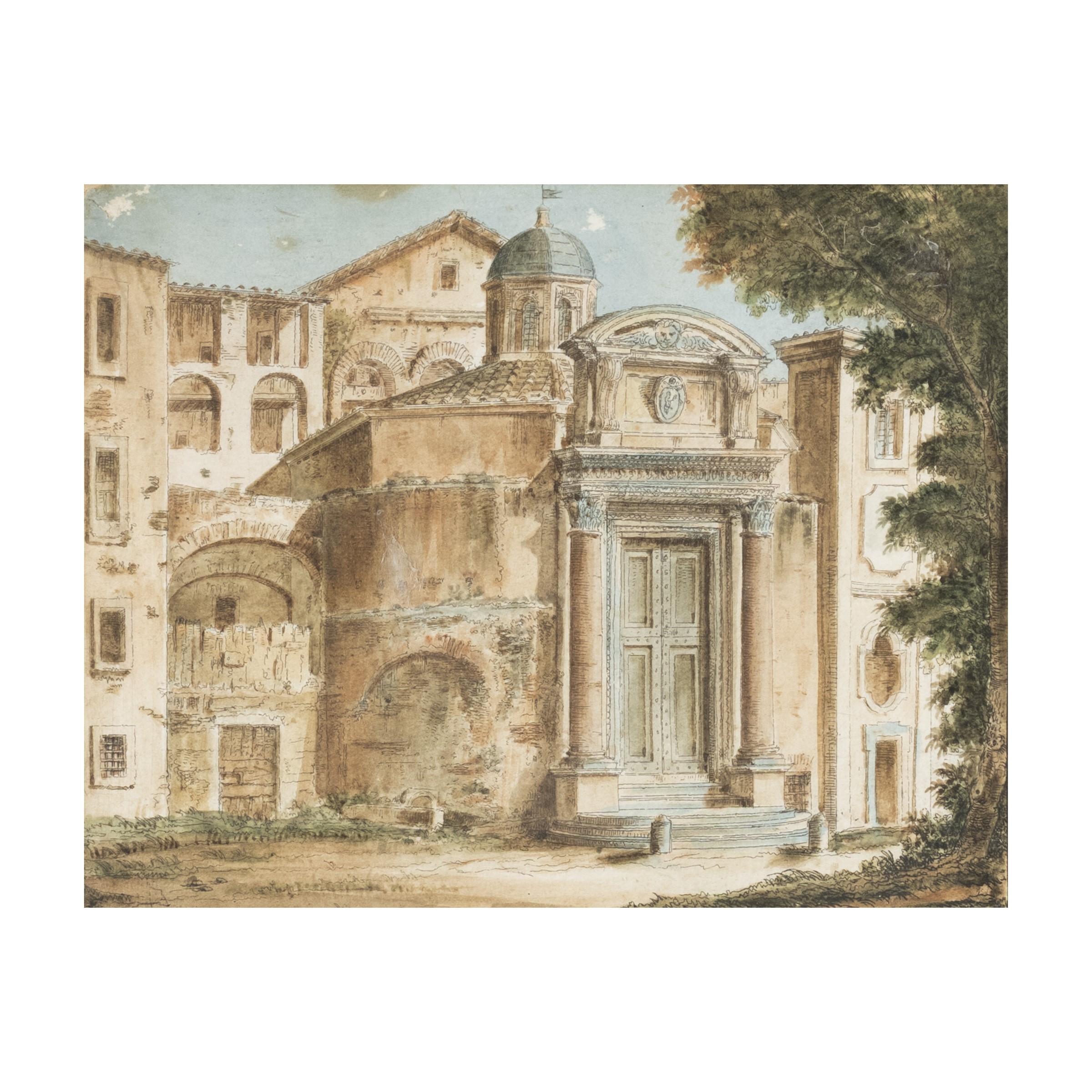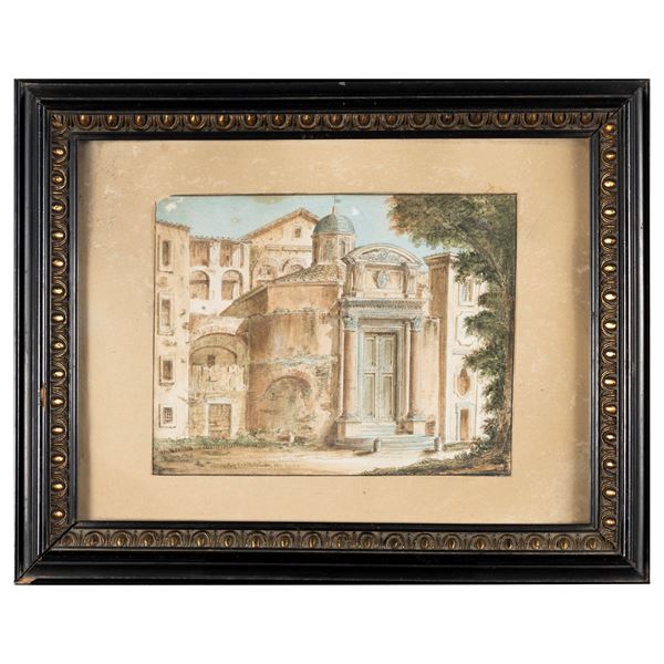 14x18 cm."Veduta della chiesa di Santi Cosma e Damiano", acquerello su carta, entro cornice