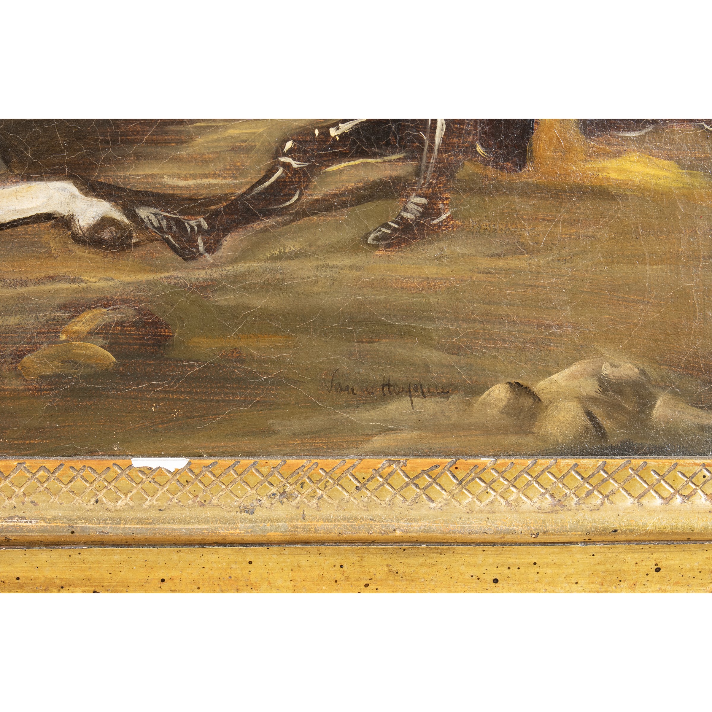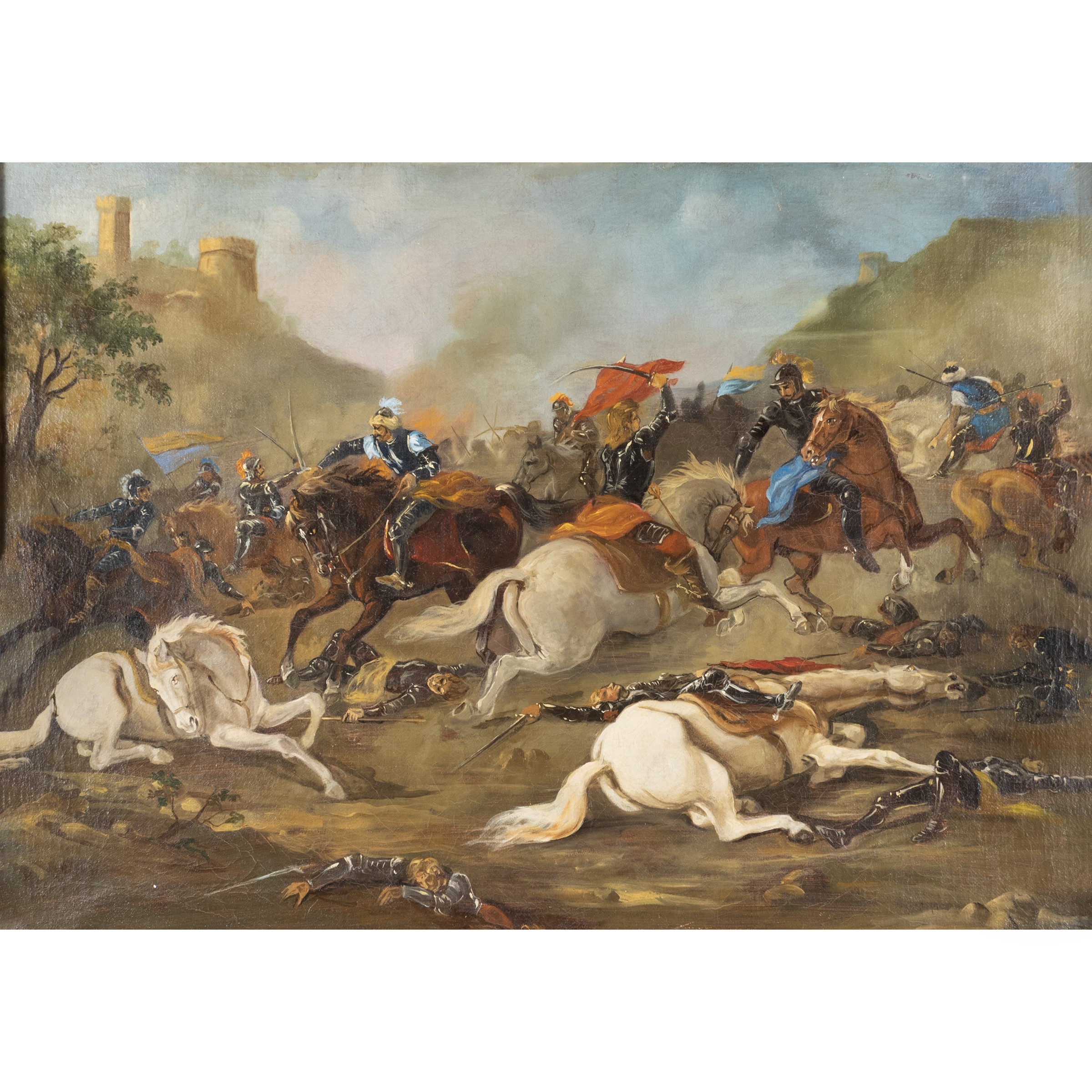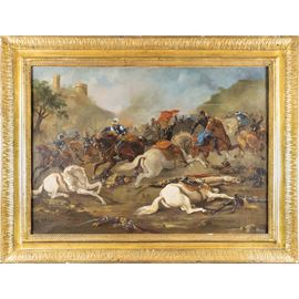 55x75 cm."Scena di battaglia", olio su tela, firmato in basso a destra, entro cornice