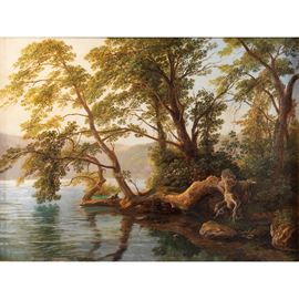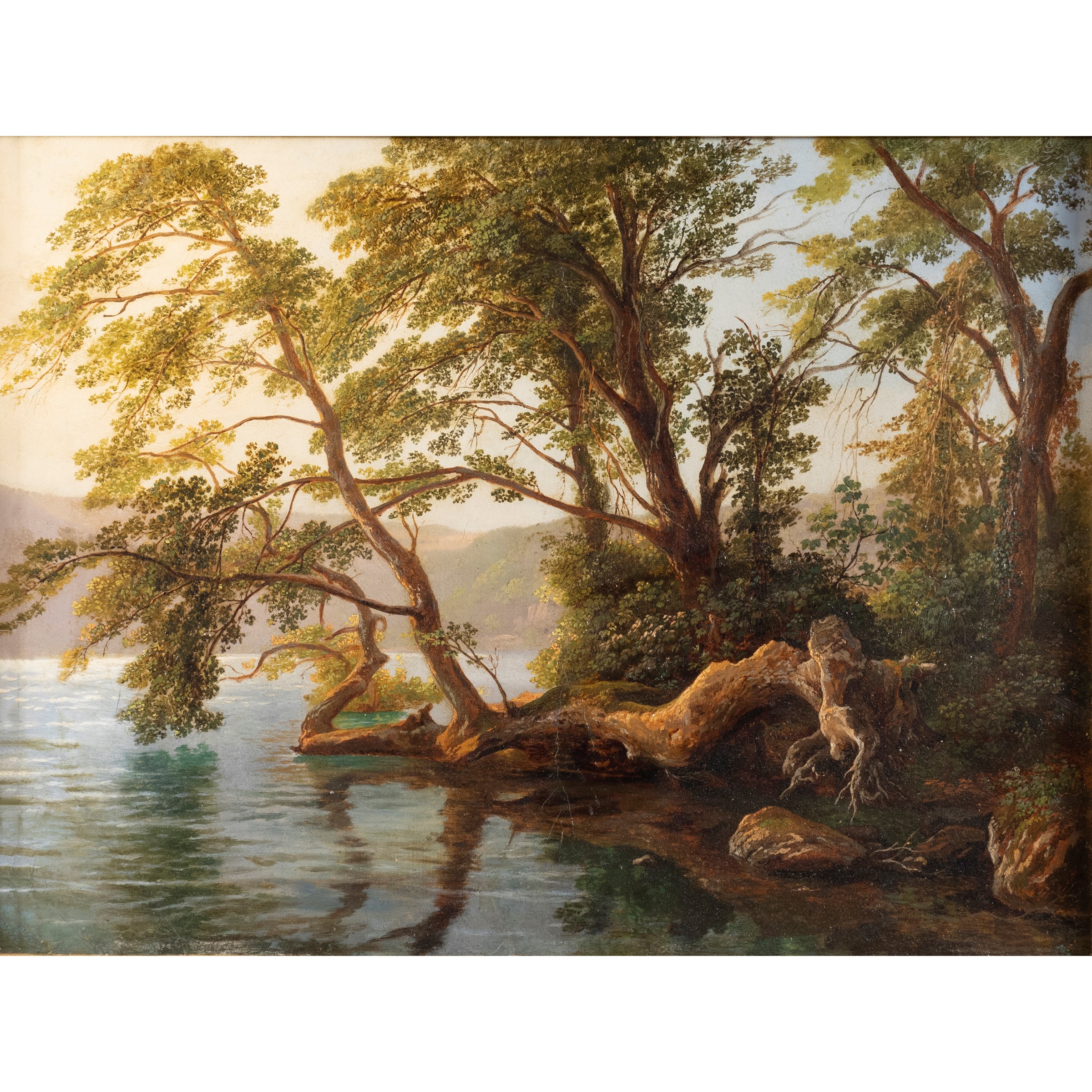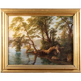 "Paesaggio lacustre", olio su tela, entro cornice