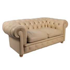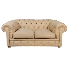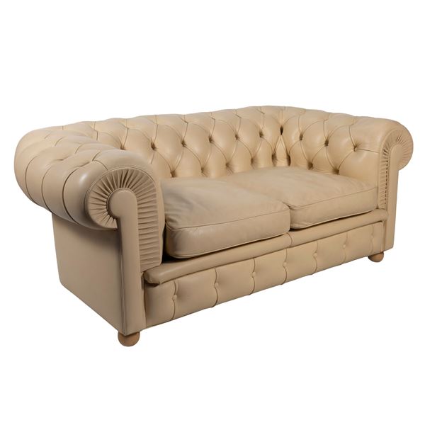 67x150x80 cm.divano a due posti mod. Chester in pelle avorio, etichetta della produzione, segni di usura