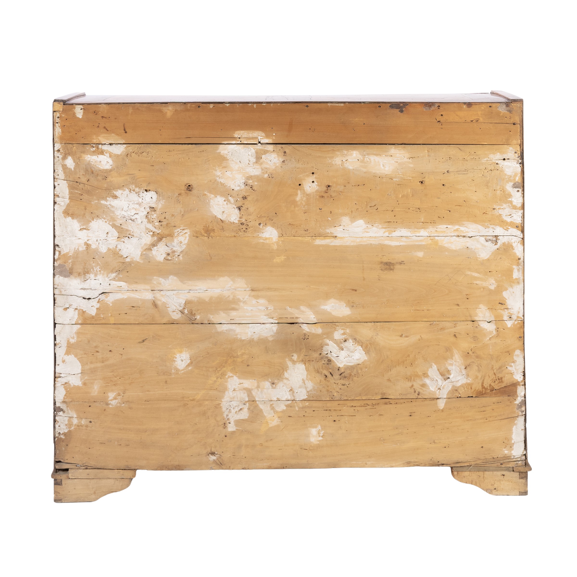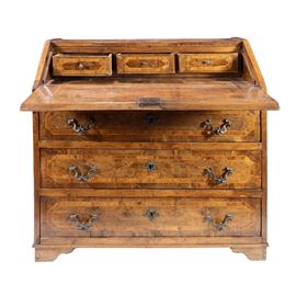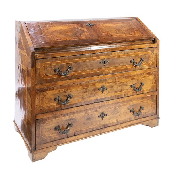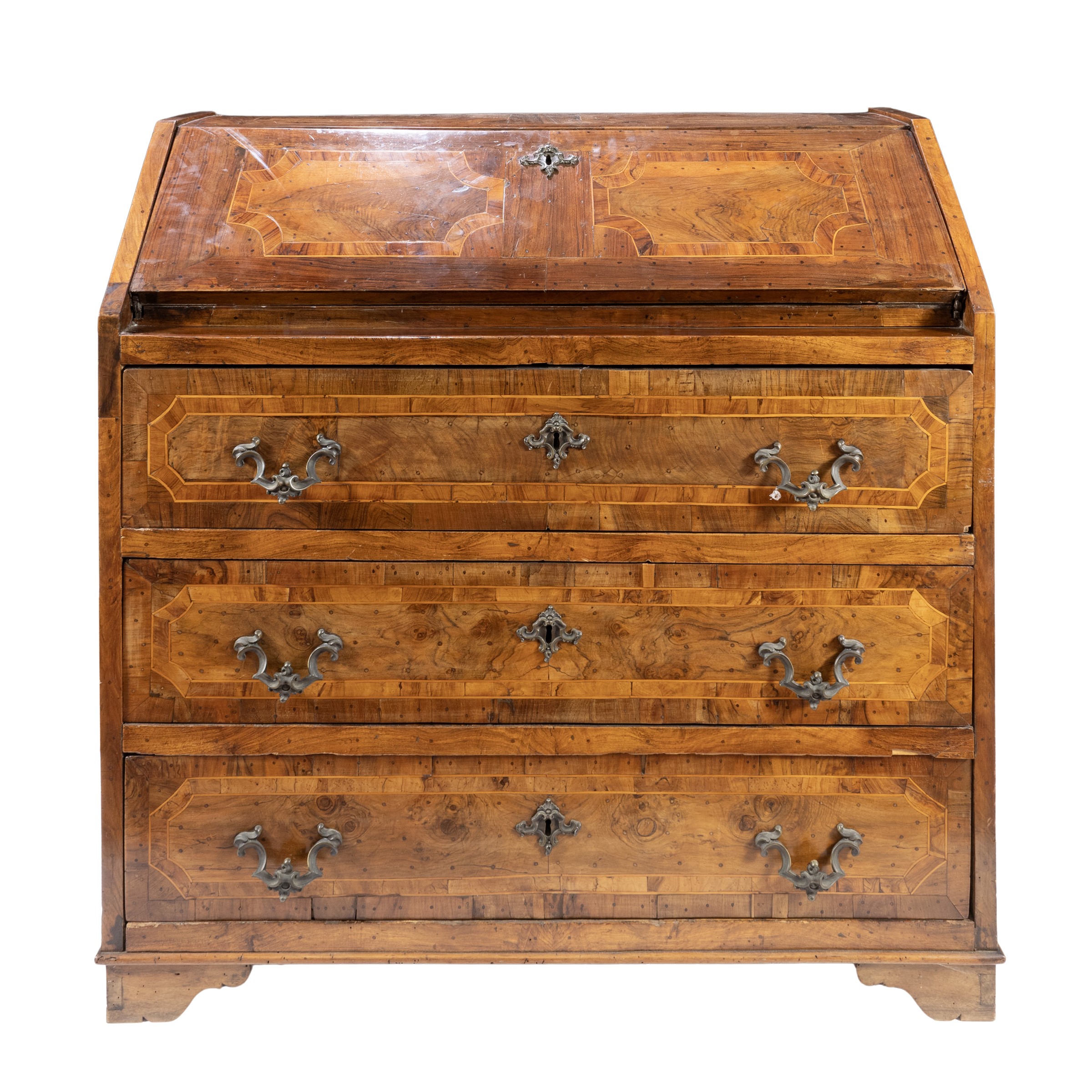110x111x54 cm.fronte a tre cassetti profilati a riserve sagomate, anta a calatoia celante scarabattolo interno, piedi a mensola, usure